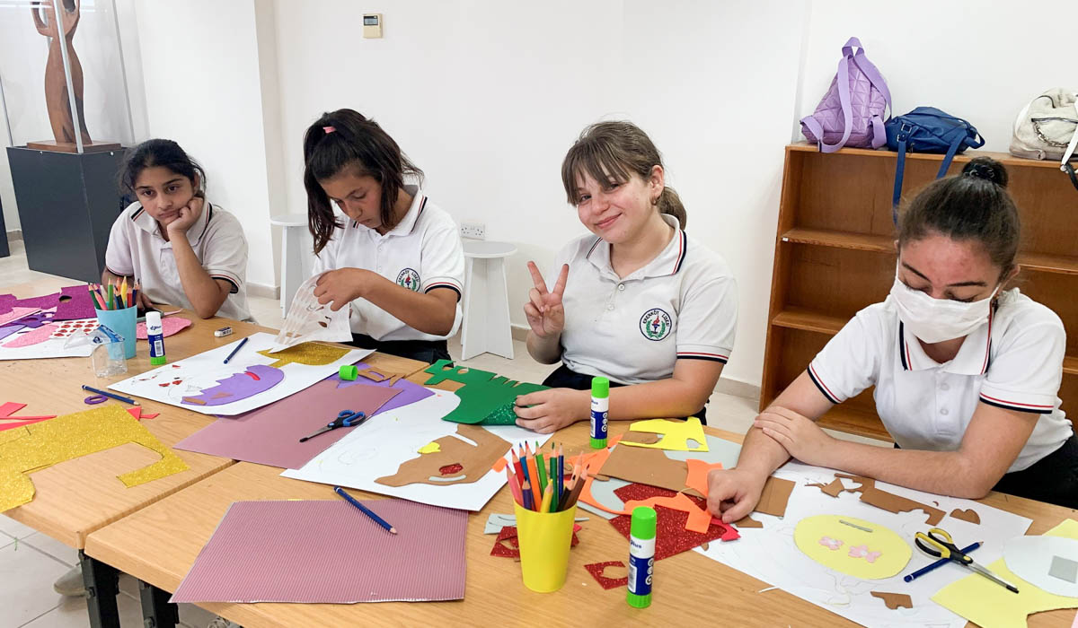30 students between the ages of 12 and 14 from Erenköy High School participated in the Art Workshop and Culture Tour event. Within the scope of the event, the students were divided into two groups and attended the “Collage Workshop” carried out by EMU Art Coordinator Zehra Şonya and the project team within the scope of the “Portraits, Styles and Stories” project developed by the EMU Rector’s Office.