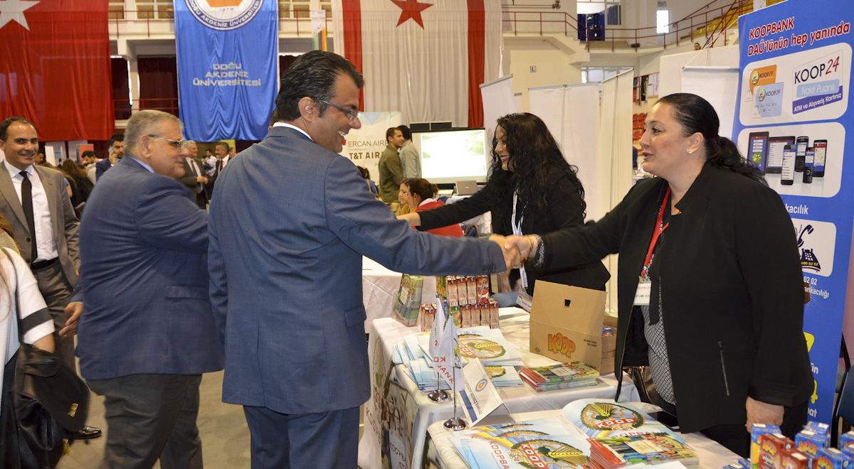 After the opening speeches TRNC Internal Affairs and Labour Minister Asim Akansoy, Famagusta Mayor Ismail Arter, President of the Board of Trustees Mehmet Bayram, Rector of the Eastern Mediterranean University Prof. Dr. Necdet Osam, Head of the Turkish Cypriot Chamber of Industry Ali Cirali and Deputy Head of the Turkish Cypriot Chamber of Commerce Vargin Varer took part in the ribbon cutting that officially opened the Career Fair.