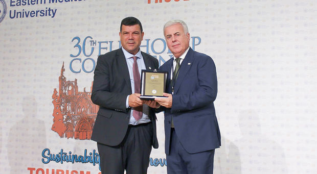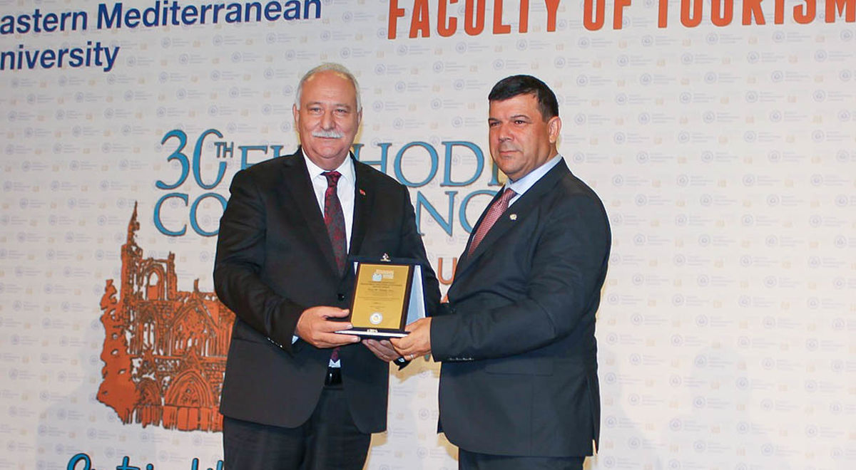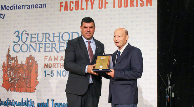 Following the opening speeches, Prof. Dr. Kılıç presented the Tourism and Hotel Management Education Outstanding Service Award to YÖDAK President Prof. Dr. Avcı and the former Dean of EMU Faculty of Tourism and Dean of Girne University Faculty of Tourism, Prof. Dr. Mehmet Altınay. Salamis Hotel General Manager Süleyman Kansu received the Tourism Sector Outstanding Service Award on behalf of Salamis Hotel General Coordinator Dr. Mehmet Kıral, and Prof. Dr. Kılıç presented a plaque of appreciation to EURHODIP President Paulo Reves.