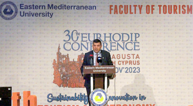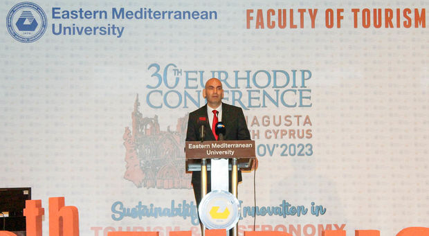 The 2023 European Association of Hospitality and Tourism Schools (EURHODIP) Conference, organized under the auspices of Eastern Mediterranean University (EMU) Faculty of Tourism with the theme 'Sustainability and Innovation in Tourism and Gastronomy', commenced on Wednesday, 1 November, 2023, at 8:00 p.m. with an opening ceremony held at Salamis Bay Conti Resort Hotel. Prior to the opening ceremony, participants gathered at 6:00 p.m. at a cocktail reception. Those attending opening ceremony also visited the award-winning photographs exhibition featuring pieces from the 'State Photo Contest' under the auspices of the Deputy Prime Ministry, Ministry of Tourism, Culture, Youth, and Environment, directed by the Cultural Department, as well as the 'Traditional Cypriot Turkish Costumes Exhibition' inaugurated by Ayhan Bıçaklı, a member of the Evaluation Committee of the Cultural Department's Support Regulation for Associations related to Fine Arts.