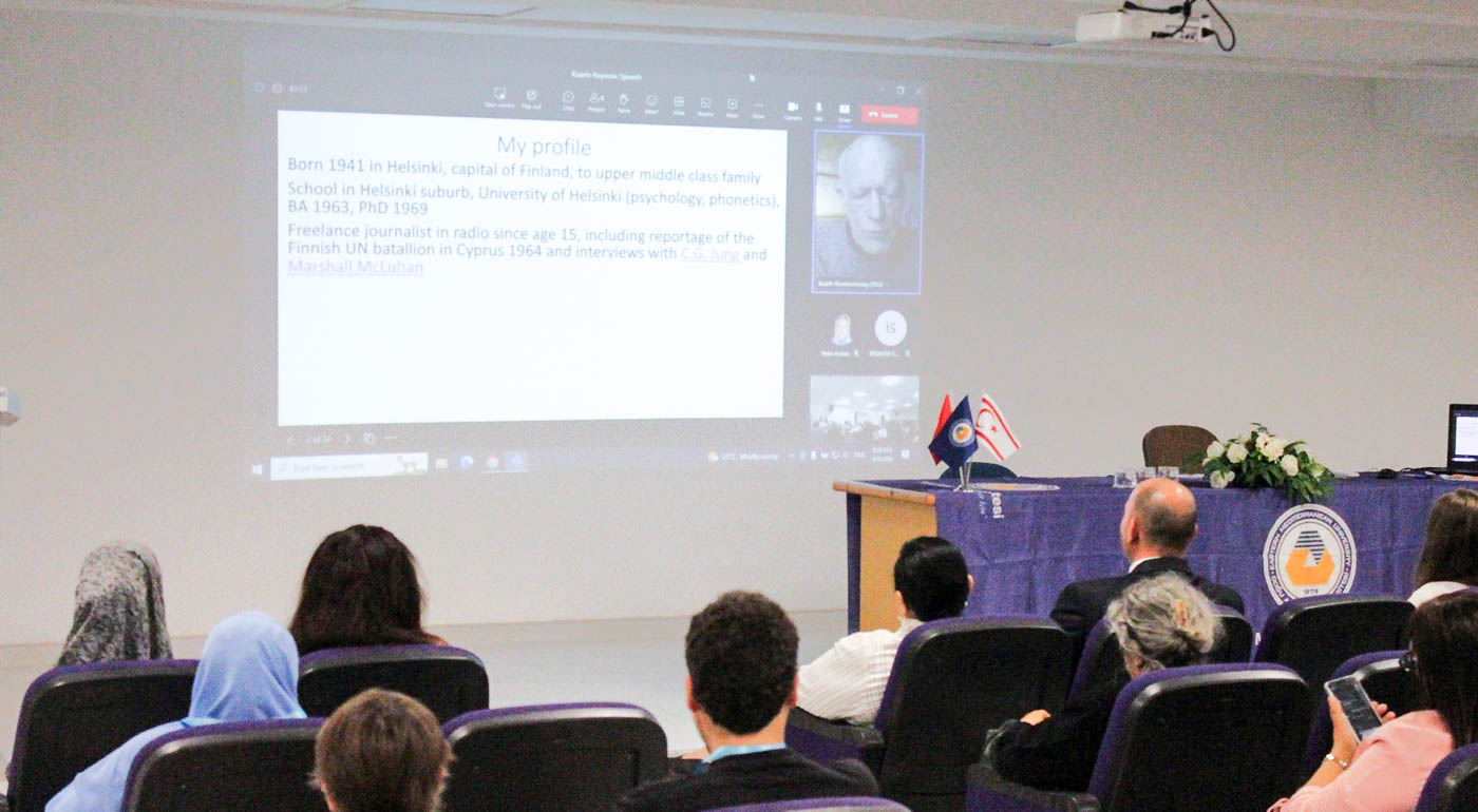 Following the opening speeches, keynote speaker Prof. Kaarle Nordenstreng joined the conference online with a presentation titled “Embracing the World Out of Order”. The first panel moderated by Prof. Dr. Hanife Aliefendioğlu commenced following the speech of Prof. Nordenstreng. The panel continued with presentations delivered by Ayça Kurdoğlu, Duygu Onay Çöker and, Prof. Dr. Hanife Aliefendioğlu and Hanife Erişen.