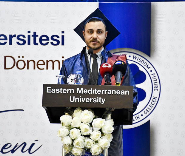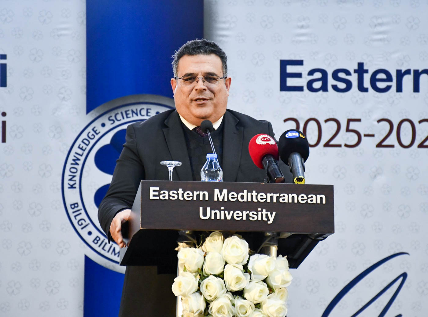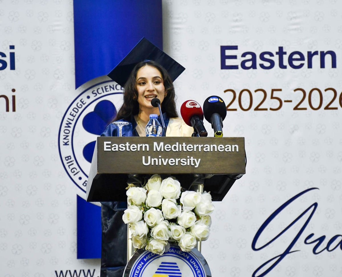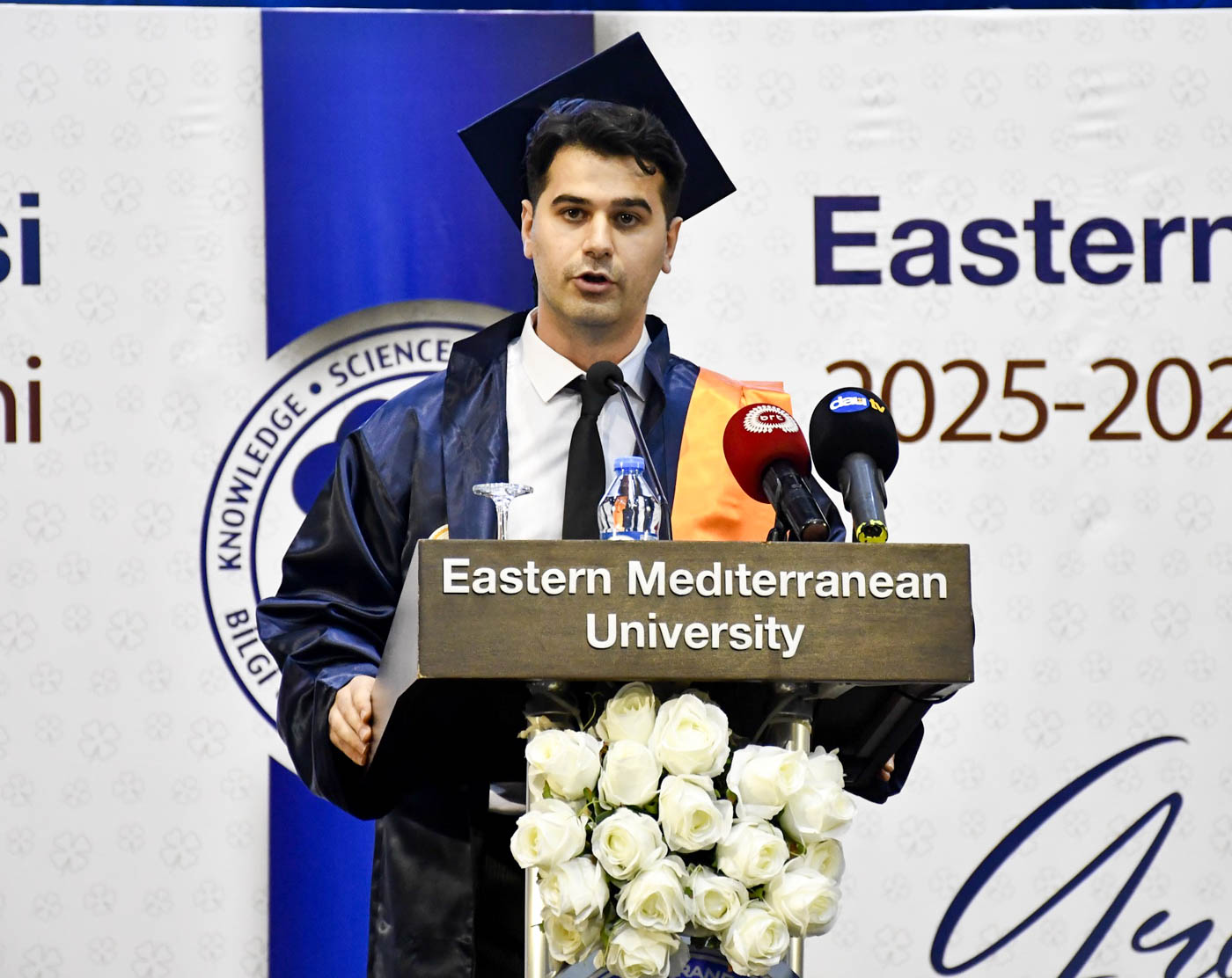 In his address, Erdal Özcenk, President of the Board of Trustees, emphasized that graduation represents not only an academic achievement but also the beginning of a new phase of life grounded in the commitment to uphold what is right and to assume responsibility. Addressing the graduates, Dr. Özcenk noted that while they may assume various positions and titles throughout their lives, they must never, under any circumstances, depart from the principles of law, justice, and conscience. He stressed the importance of defending what is right and fair rather than what is easy or popular. Dr. Özcenk pointed out that those who remain on the path of integrity may occasionally find themselves alone, yet they will never be judged unfavorably by history. He stressed that EMU and the country now need young people more than ever who act with knowledge, moral awareness, and courage. Congratulating families for raising individuals of strong character, Dr. Özcenk thanked the academic and administrative staff for their unwavering commitment to science and education despite challenging circumstances. He further underlined that Eastern Mediterranean University and the country need young individuals more than ever who act with knowledge, conscience, and courage. Congratulating families for raising individuals of strong character, Dr. Özcenk expressed his gratitude to the academic and administrative staff for their dedication to science and education despite challenging circumstances. Emphasizing that graduation is not a farewell but the beginning of a lifelong bond with Eastern Mediterranean University, Dr. Özcenk advised graduates to take the law as their compass and conscience as their guide, and wished them continued success.