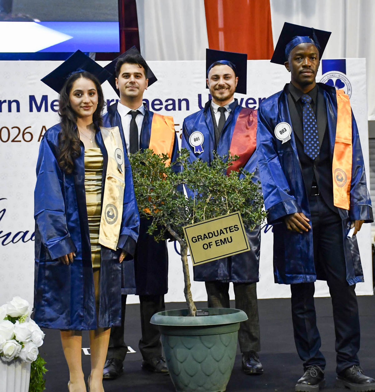 In the continuation of the program, speeches on behalf of the graduates were delivered by Mehmet Oktar Önder, a graduate of the Faculty of Engineering, Department of Software Engineering and Founding President of the EMU Software and Artificial Intelligence Development Club; Buse Dülger, top graduate of the Faculty of Education, Department of English Language Teaching; Caleb Sakala, top graduate of the Faculty of Engineering, Department of Software Engineering; and Oğuz Ufuk Haksever, a graduate of the International Relations PhD Program at the Faculty of Business and Economics. Following the speeches, the ceremony continued with protocol addresses after a symbolic tree-planting ceremony carried out by the graduate representatives.