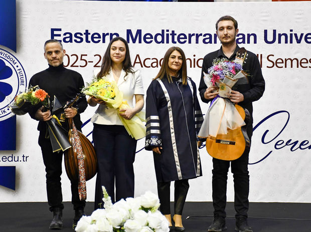 The ceremony began with the graduates’ entrance into the stadium accompanied by applause and music. Following a moment of silence and the National Anthem, the program continued with a musical performance by Oud Artist Ahmet Sönmez and his ensemble. After the performance, flowers were presented to the artist and his team by EMU Vice Rector for Student Affairs Prof. Dr. Sonuç Zorlu.