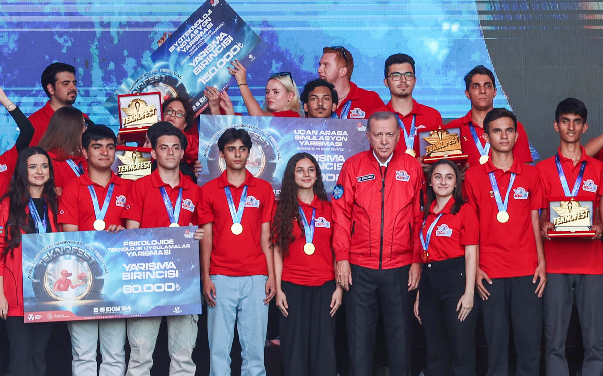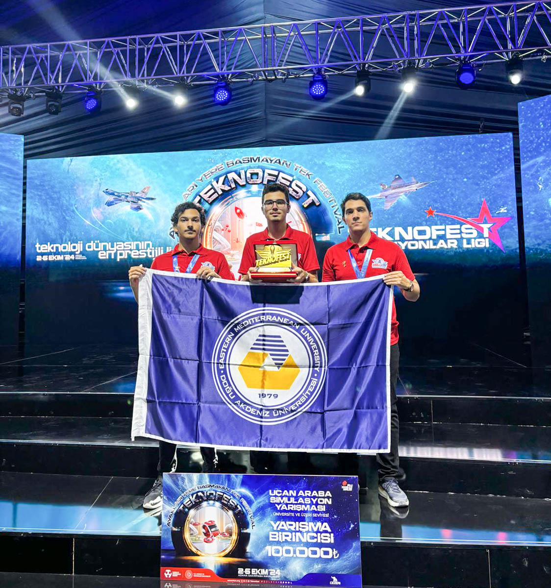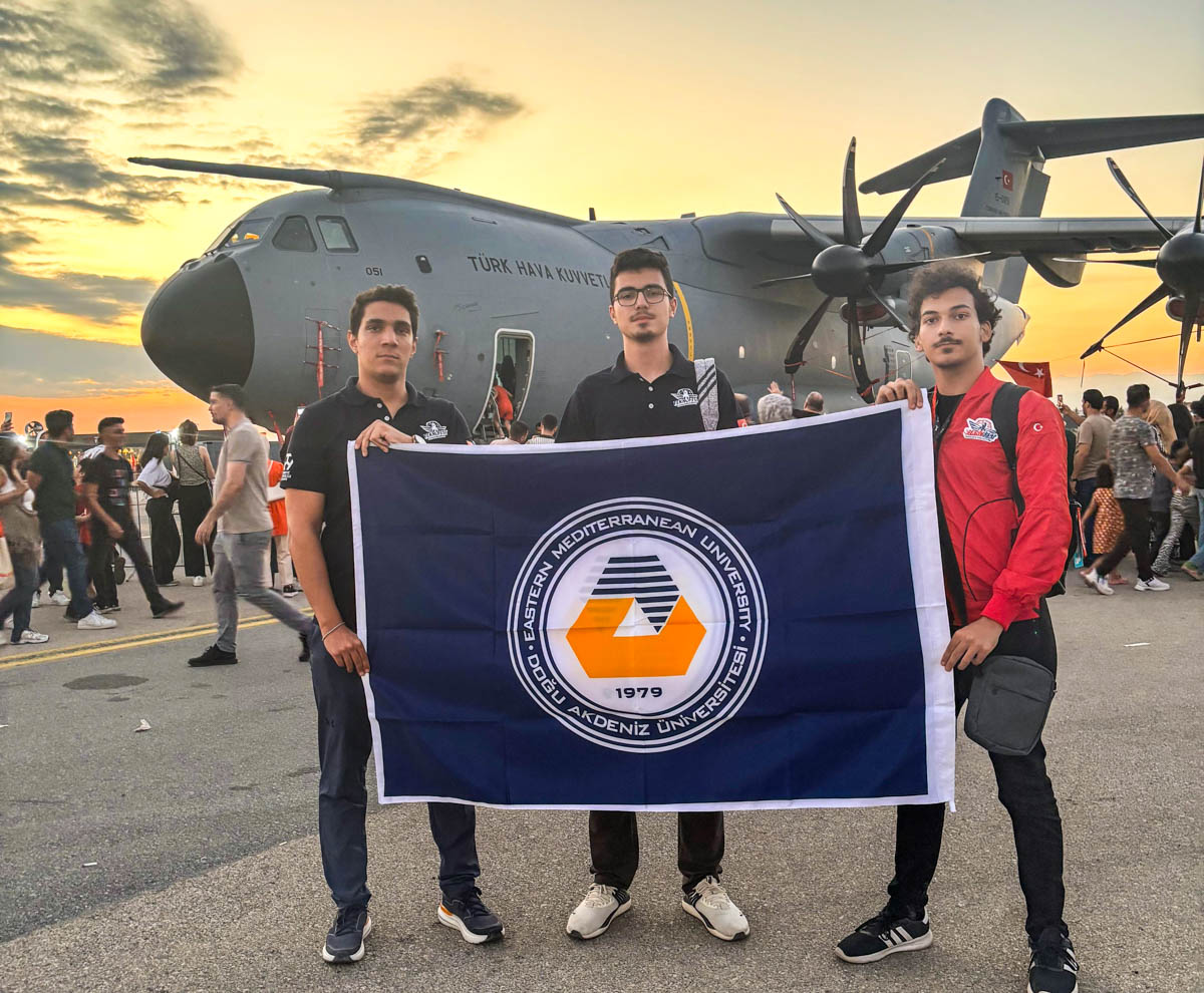 Completing the ‘Flying Car Simulation Competition’ organized by Teknofest, the biggest technology festival of Türkiye, in first place, ASHINA team consisting of Eastern Mediterranean University (EMU), Faculty of Engineering, Information Systems Engineering Program student Furkan Batı and Computer Engineering Program students Deniz Demir and Cemre Yeşil received their award. The Teknofest Award Ceremony was held on 4 October 2024 at Şakirpaşa Airport in Adana with the participation of the President of Republic of Türkiye Recep Tayyip Erdoğan. EMU ASHINA team took pride in successfully representing EMU.
