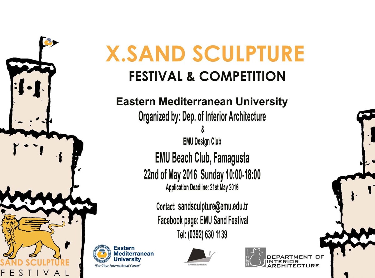 10th Sand Sculpture Festival and Competition invites everyone who wish to participate in the activity. Deadline for registration for the competition and the festival is 21 May 2016. For further information, those interested in the event may visit EMU Sand Festival facebook page, or send an e-mail to sandsculpture@emu.edu.tr. Candidates wishing to participate may register through the event website or the e-mail address provided below or call 630 11 39.