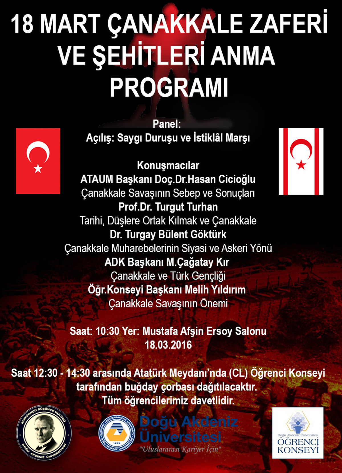 To mark 18 March Çanakkale Victory and Martyrs’ Day, EMU Student Council will be offering wheat soup to students at EMU Atatürk Square between 12:30 p.m. and 2:30 p.m. on Friday, 18 March 2016.