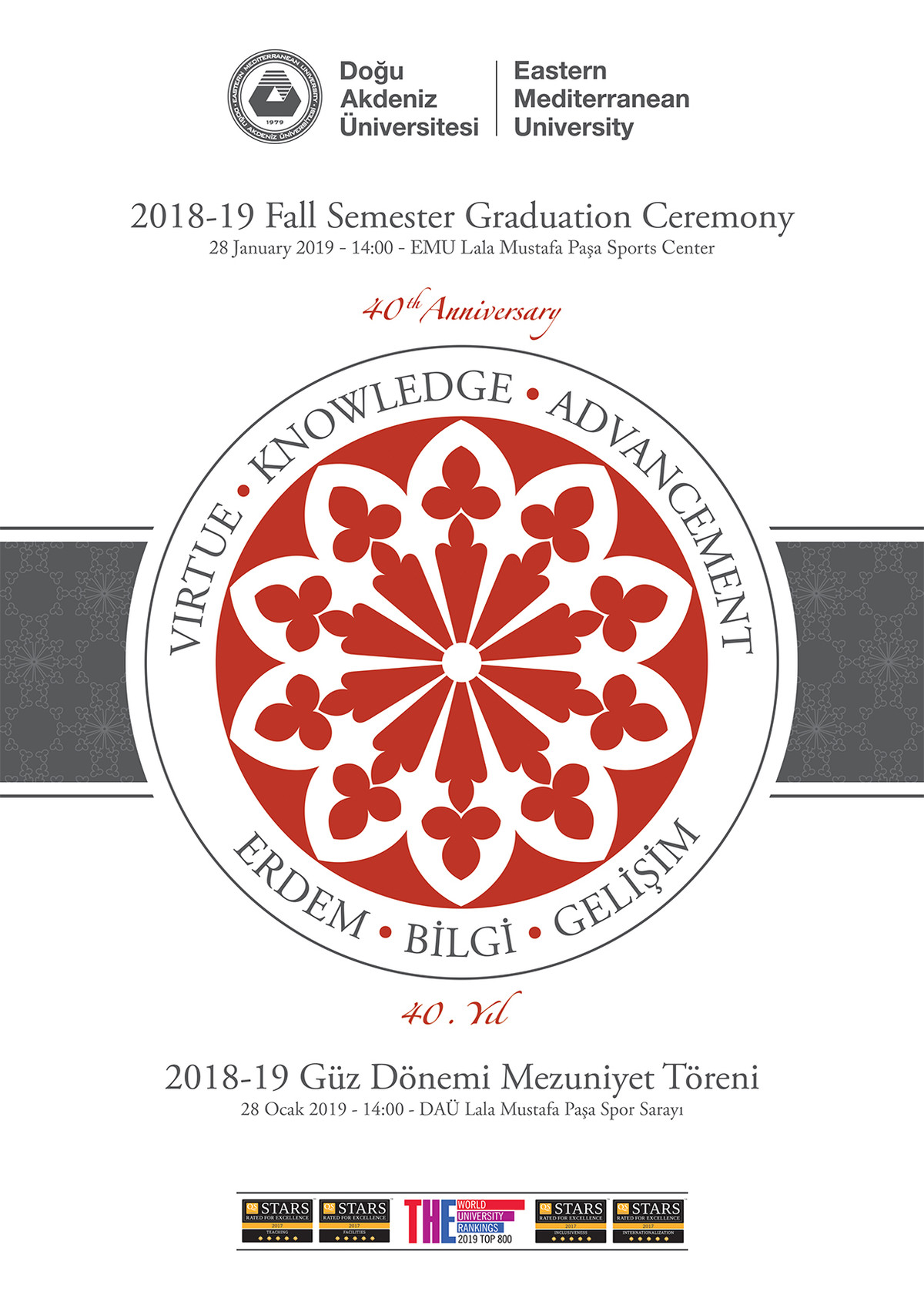For achieving a smooth flow of process during the Graduation Week, a rehearsal will be held on January 25th 2019, Friday (10:00 a.m.) at EMU Lâlâ Mustafa Paşa Sports Complex. Another rehearsal will also be held for graduate students on the same day at 14:00 at Rauf Raif Denktaş Culture and Congress Center.