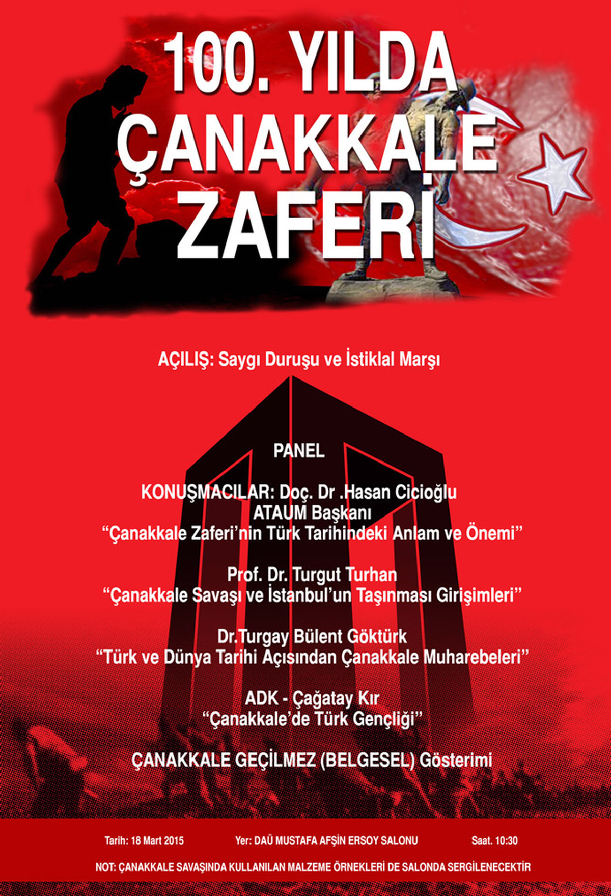 The first organisation entitled “Çanakkale Victory in Its 100th Anniversary” will take place at EMU Mustafa Afşin Ersoy Hall at 10:30 a.m. on Wednesday, 18 March 2015. The event which will commence with a moment of silence and the national anthem will continue with a panel on Çanakkale War.