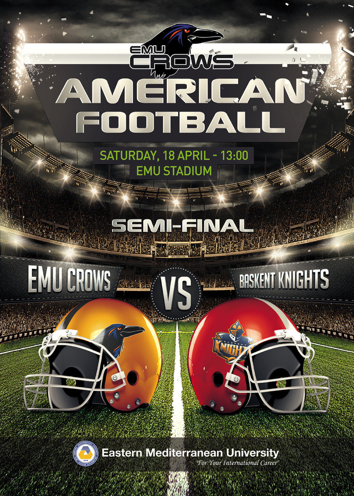 All university staff and students are cordially invited to the match taking place between the American Football Club “EMU Crows” operating under the Social and Cultural Activities Directorate and Başkent University American Football Team “Başkent Knights”.