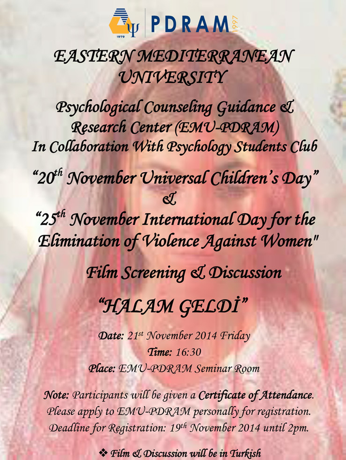 Psychological Counseling Guidance & Research Center (EMU-PDRAM) In Collaboration With Psychology Students Club “20th November Universal Children’s Day” & “25th November International Day for the Elimination of Violence Against Women" Film Screening & Discussion “HALAM GELDİ”