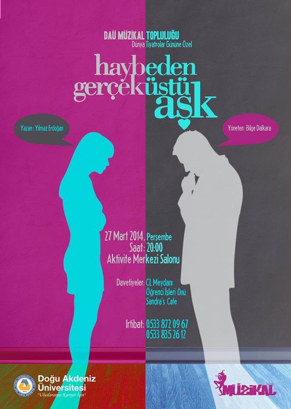 The Musical Community, operating under the Social and Cultural Activities Directorate cordially invites all university staff and students to a musical play entitled “Haybeden Gerçeküstü Aşk”, written by Yılmaz Erdoğan.
