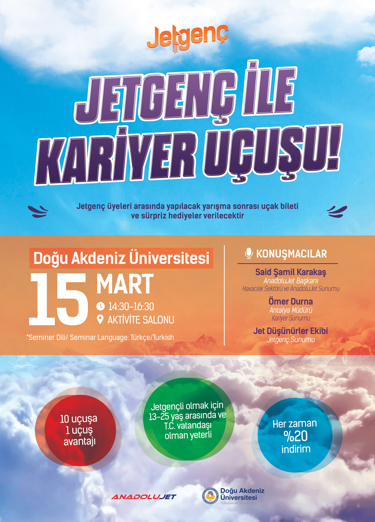 Thu, 9 March 2017 08:36:00 #anadolujet#havacılık sektörü#ömer durna#said şamil karakaş Starts: Wed, 15 March 2017 14:30:00 Ends: Wed, 15 March 2017 16:30:00 Location: Activity Hall This event will be held in Turkish. Eastern Mediterranean University Eastern Mediterranean University