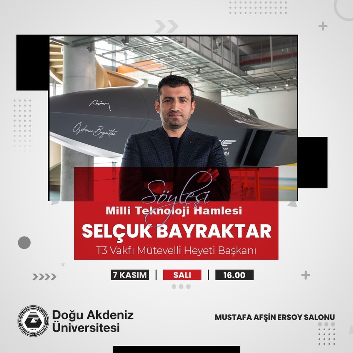 BAYKAR Executive Board President, the architect of Turkey's first national UAV systems and the first national unmanned combat aerial vehicle Bayraktar KIZILELMA, Technology Leader Selçuk Bayraktar will hold a talk on "National Technology Initiative" at the Eastern Mediterranean University. The talk organized by EMU Rector’s Office will take place on Tuesday, 7 November, 2023, at 4:00 p.m. at the Mustafa Afşin Ersoy Hall.