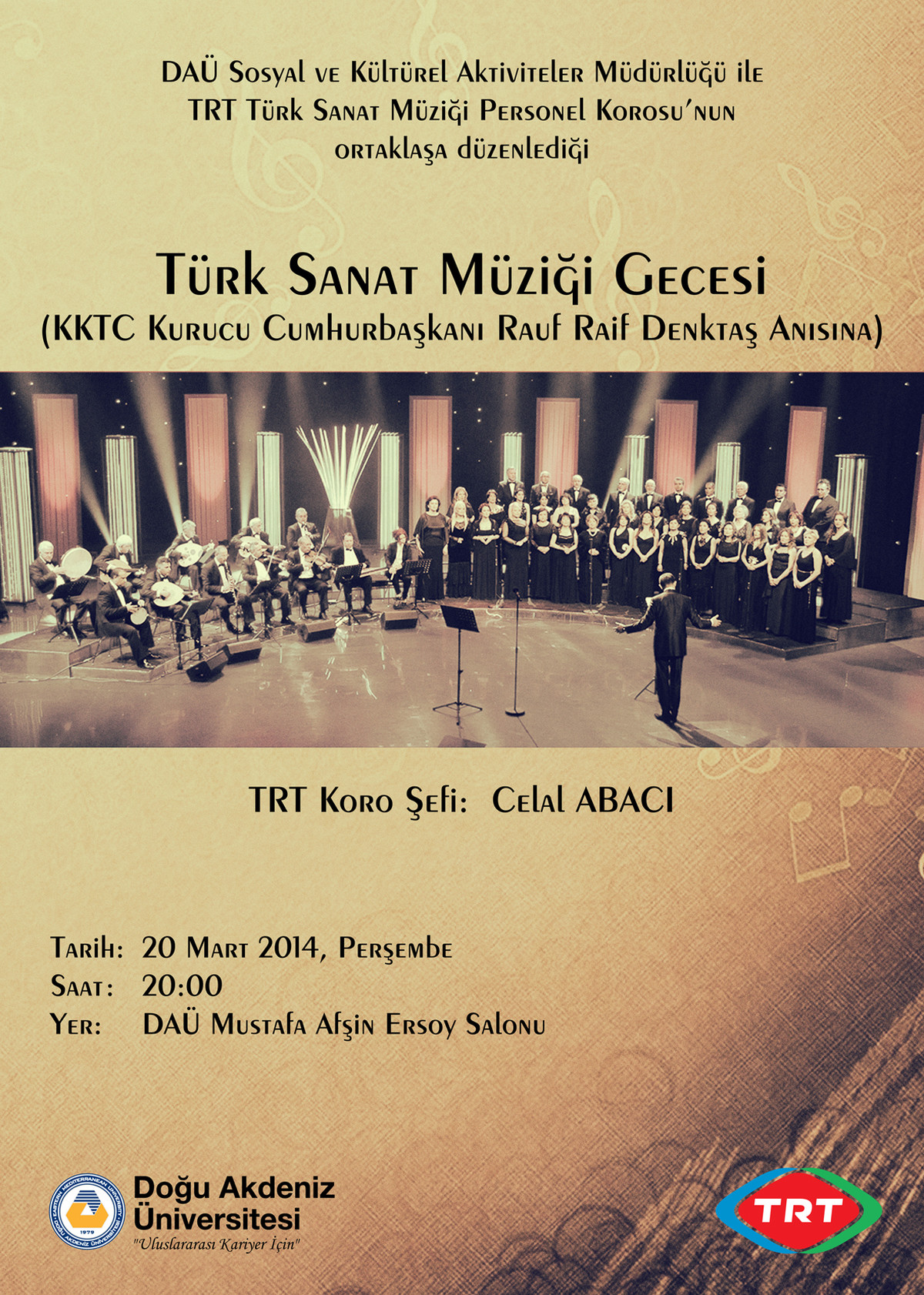 The “Turkish Classical Music Night” organized collaboratively by Eastern Mediterranean University (EMU) Social and Cultural Activities Directorate and TRT Turkish Classical Music Staff Choir, in memory of TRNC Founding President Rauf Raif Denktaş will be held on March 20th 2014 Thursday night at EMU Mustafa Afşin Ersoy Hall.