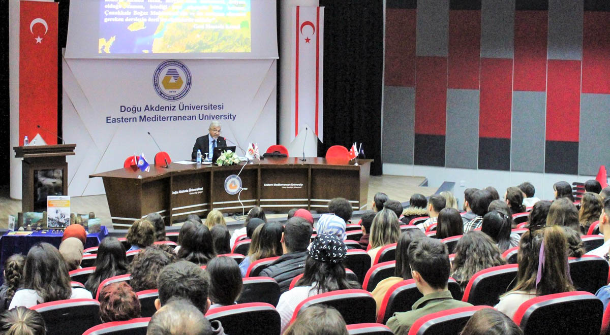 The program commenced with “Military and Political Aspects of the Battle of Çanakkale” conference by Chair of EMU ATAUM Assist. Prof. Dr. Turgay Bülent Öztürk on Friday, 17 March 2023 at 10:30 at EMU Mustafa Afşin Ersoy Hall. The conference, which commenced following a minute of silence and national anthem, attracted great interest from the students.