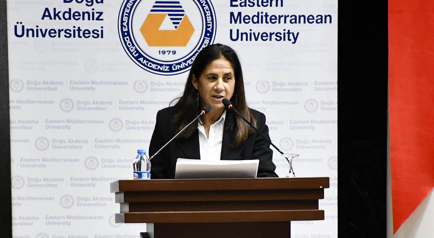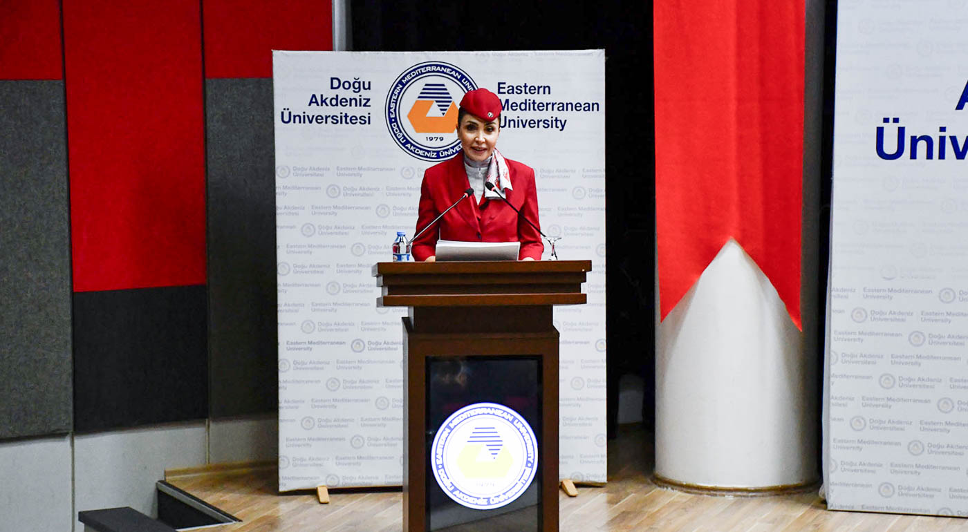 THY Cabin Supervisor Gülnur Mezeine shared her years of experience and love for flying with the students, stressing that every crew, flight, and journey brings its own unique excitement. She spoke about the importance of the uniform, explaining that it embodies a brand, a culture, and a sense of safety. Mezeine also discussed the duties of the cabin crew, emphasizing that civil aviation relies on teamwork. Addressing the students directly, she added: “You are confident, cultured, and capable students of EMU. I have faith in you and believe that with every flight, you will carry your country, your values, and your humanity”.