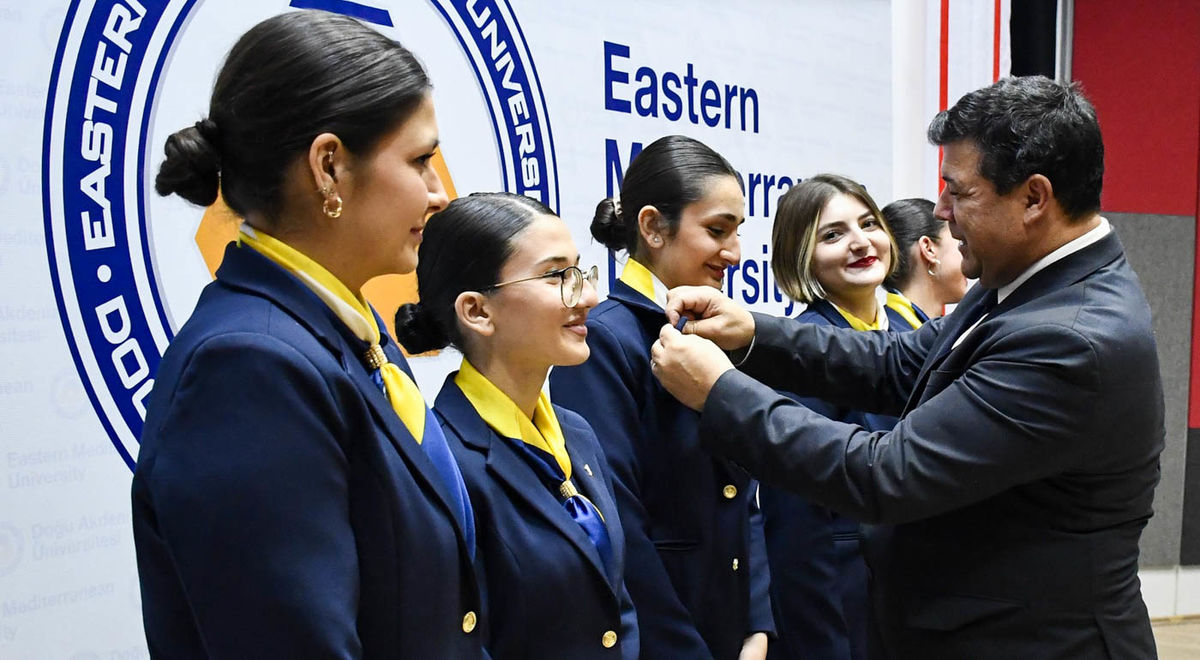 A “Uniform Ceremony” was organized for the students of Eastern Mediterranean University (EMU), Faculty of Tourism, Civil Aviation and Cabin Services Program. During the ceremony held at Mustafa Afşin Ersoy Hall, nearly 100 students from the Civil Aviation and Cabin Services Program took an important step towards the profession, proudly wearing their uniforms and attaching the EMU emblem pins to their lapels.