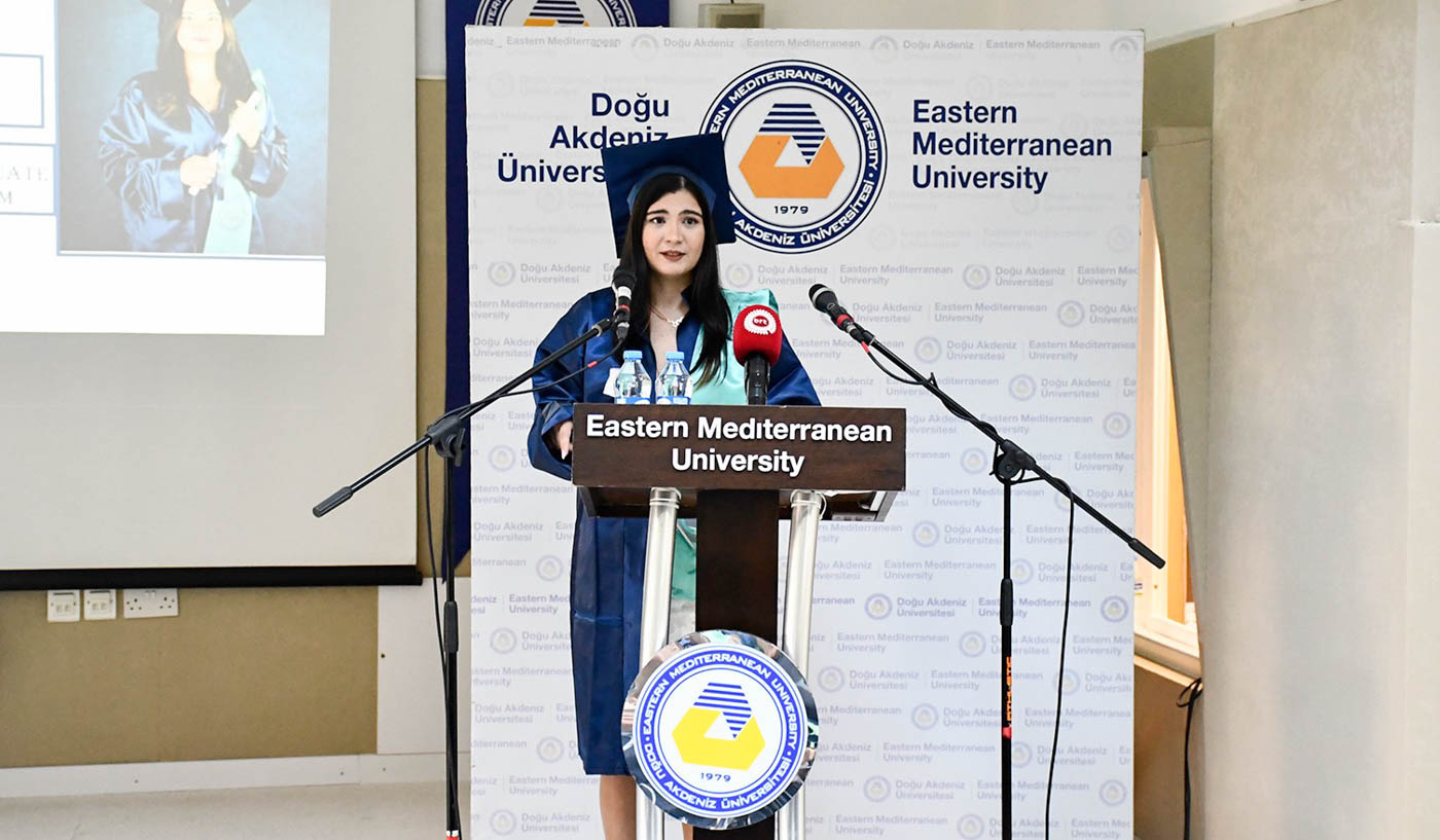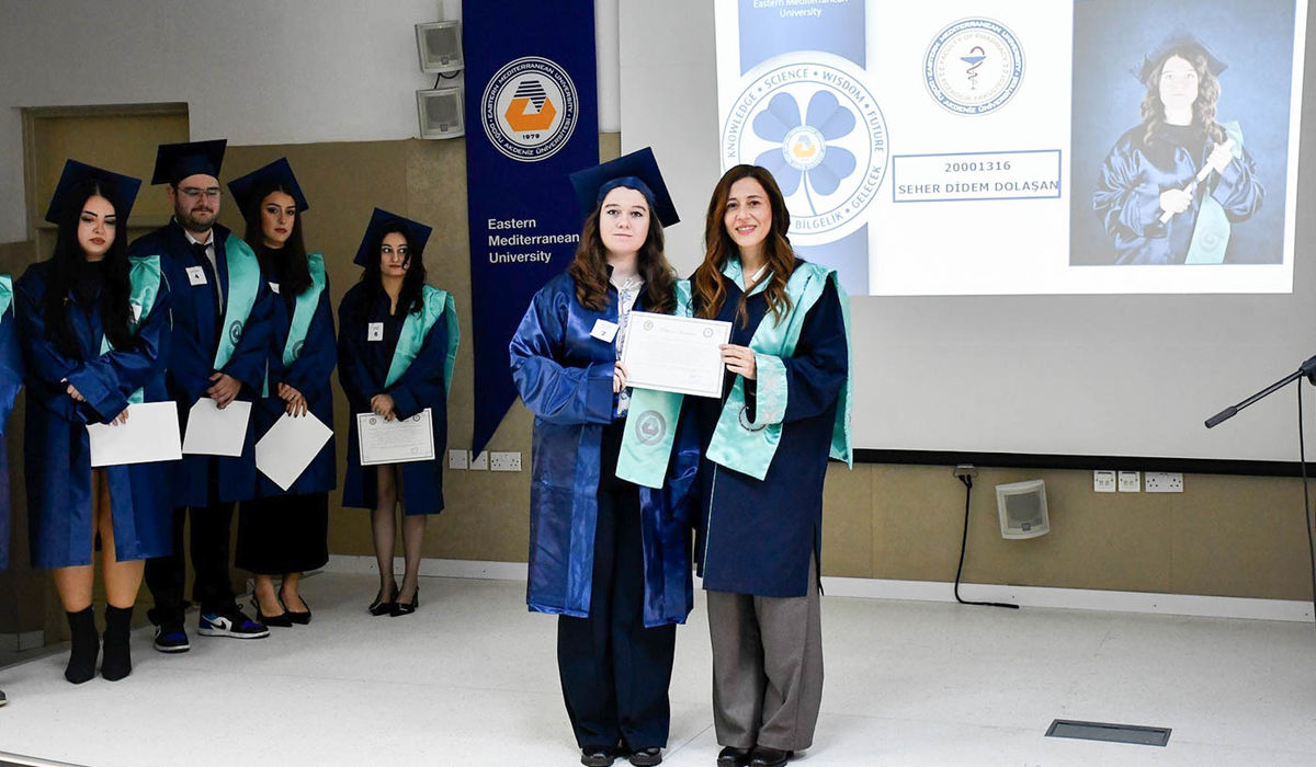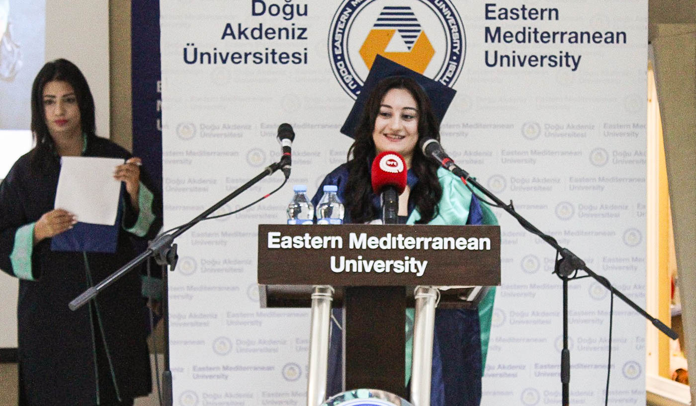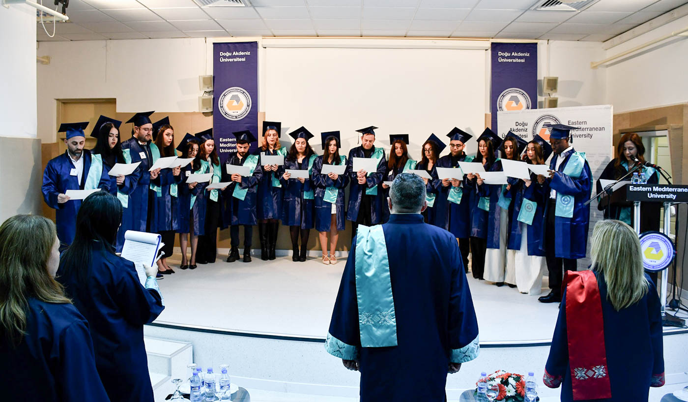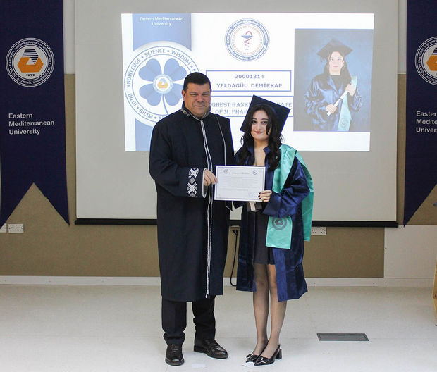 The ceremony commenced with observation of a Moment of Silence and National Anthem, followed by a musical performance by EMU Faculty of Pharmacy student Şahnaz Gökel and musician Yüksel Günay Bilgeer. Present at the ceremony were the EMU Rector Prof. Dr. Hasan Kılıç, EMU Vice Rectors Prof. Dr. Osman M. Karatepe, Prof. Dr. Sonuç Zorlu and Prof. Dr. Ali Öztüren, EMU General Secretary Derviş Ekşici, Dean of the Faculty of Pharmacy Prof. Dr. Hayrettin Ozan Gülcan, Dean of EMU Faculty of Health Sciences Prof. Dr. Mehtap Malkoç, Dean of EMU Dr. Fazıl Küçük Medicine Faculty Prof. Dr. Nilüfer Güzoğlu, the Vice Deans of Faculty of Pharmacy, Department Chairs, academics and graduates.