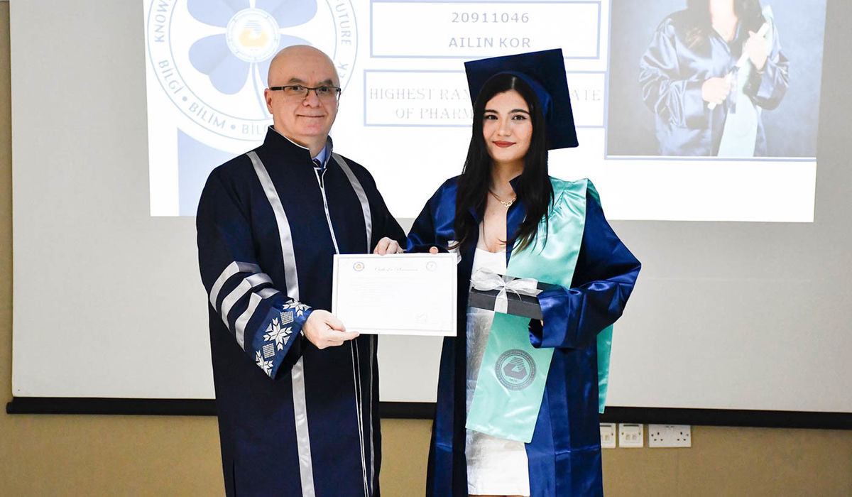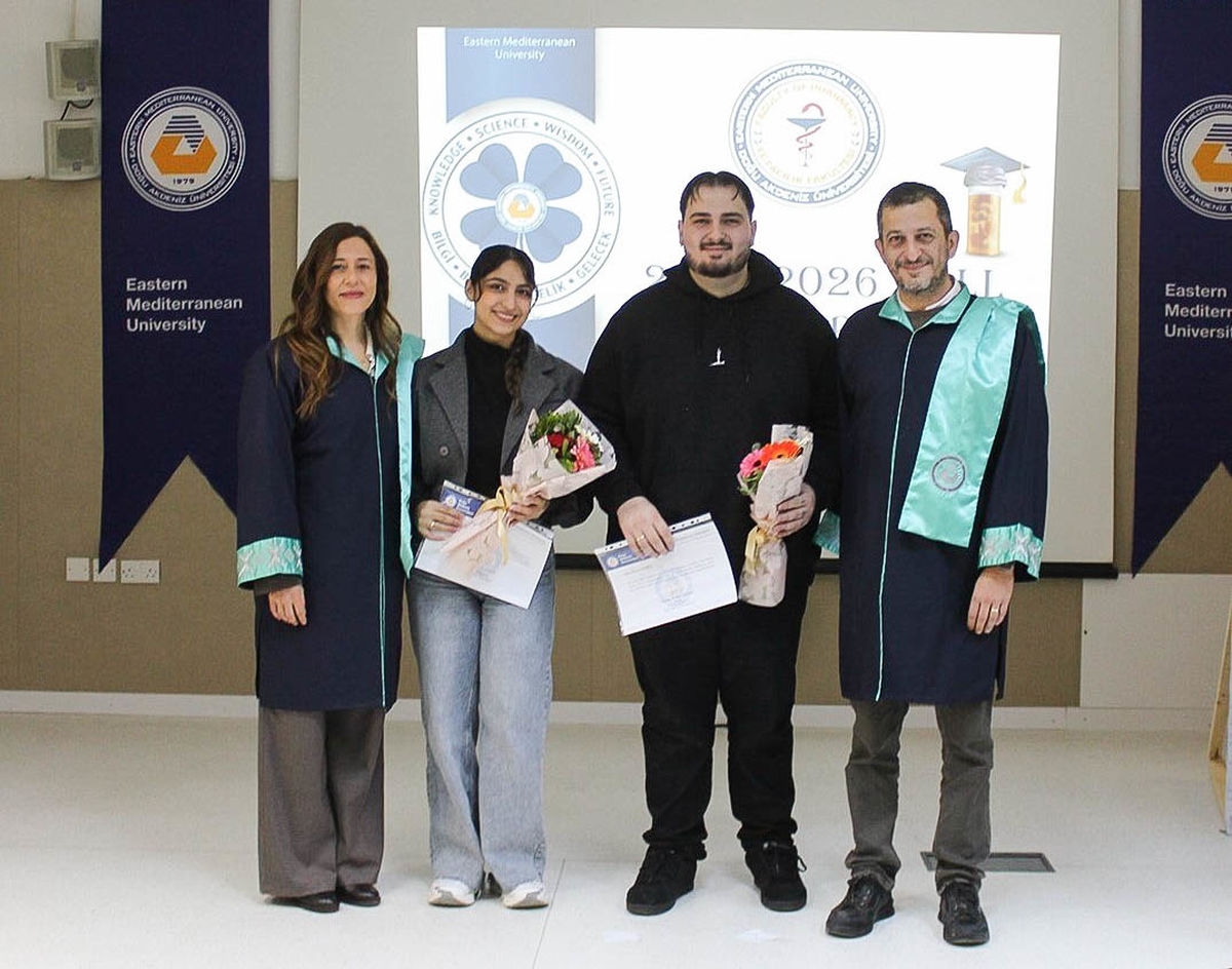 The program continued with the speeches of 2025 – 2026 Academic Year Fall Semester top ranking student of M.Pharm Yelda Demirkap and top ranking student of Pharm-D program Ailin Kor. Then, the ceremony continued with presentation of awards to Demirkap and Kor by EMU Rector Prof. Dr. Hasan Kılıç and EMU Vice Rector Prof. Dr. Osman M. Karatepe.