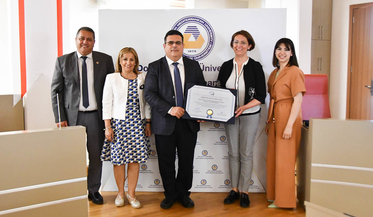 After the opening speeches, the said accreditation certificate was presented to EMU Rector Prof. Dr. Aykut Hocanın by SABAK Vice President Prof. Dr. Kayıkçı. Prof. Dr. Aykut Hocanın presented a gift with the EMU logo to Prof. Dr. Kayıkçı and Prof. Dr. Malkoç. The ceremony concluded with the presentation of certificates of appreciation and gifts unique to EMU to the academic and administrative staff who supported the accreditation efforts.