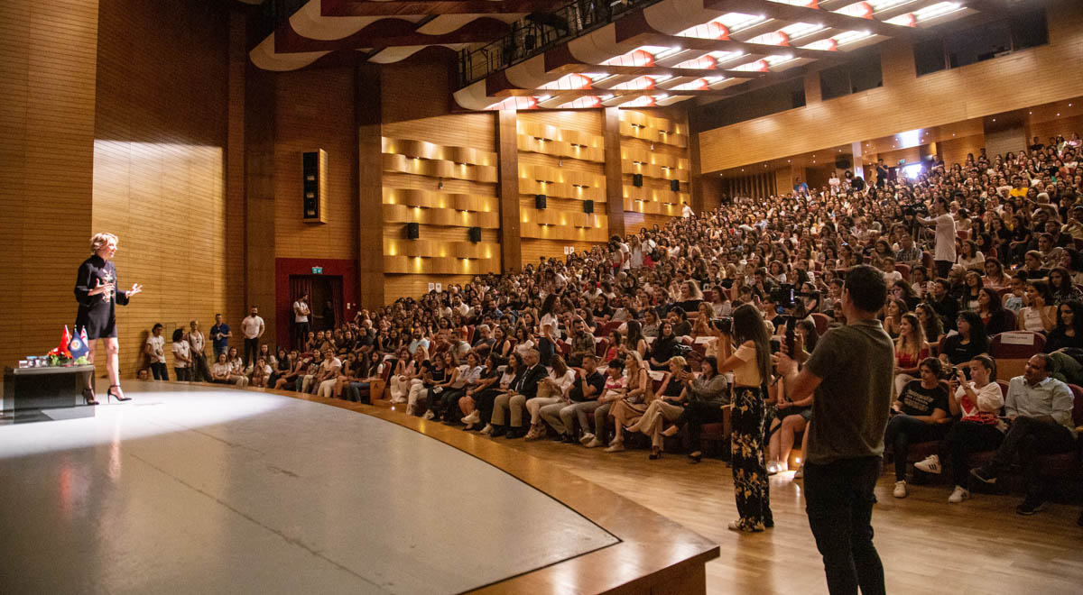 Famous artist Gülse Birsel delivered a talk at the Eastern Mediterranean University (EMU) after arriving in the Turkish Republic of Northern Cyprus (TRNC) for the 24th Spring Festival. The said talk took place at 17:00 on Saturday, the 18th of May 2019. Interest towards the talk which was held at the Rauf Raif Denktaş Culture and Congress Center was high. Gülse Birsel took to the stage amidst applause later stating: “I am at a fantastic university I am very jealous of. I see that the Medicine Faculty has been established and it has significantly grown. EMU has become a very important university. I look at the Spring Festival program from the internet. Everyone but Robert De Niro is here. I haven’t seen so many celebrities in one place, even in İstanbul’s coolest award ceremonies. Cypriot cuisine is also fantastic. You are very lucky to be studying here.”