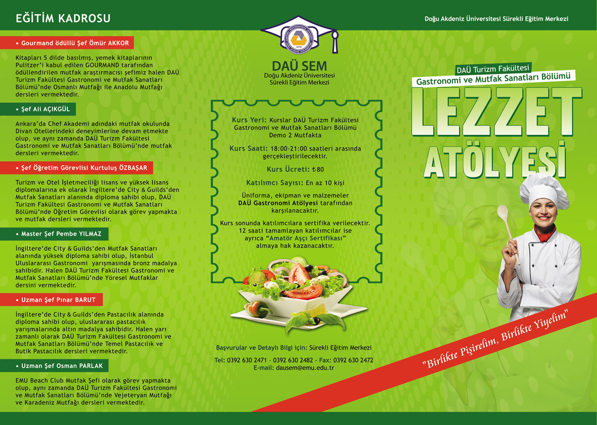 Doğu Akdeniz Üniversitesi’nde 11 Mayıs – 19 Haziran 2015 tarihleri arasında “Lezzet Atölyesi” gerçekleştirilecek. DAÜ Sürekli Eğitim Merkezi (DAÜ – SEM) ve DAÜ Turizm Fakültesi, Gastronomi ve Mutfak Sanatları Bölümü işbirliğiyle organize edilen “Lezzet Atölyesi”ne katılanlar tanınmış şefler eşliğinde çeşiti yiyeceklerin yapımını ve sunumunu öğrenerek, kurs sonunda “Amatör Aşçı Sertifikası” almaya hak kazanacaklar.
