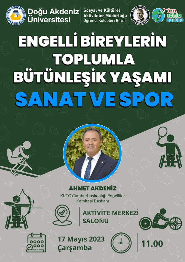 Kültür, spor ve sanat ile hep birlikte daha güçlü yarınlara ulaşmayı hedefleyen DAÜ, 17 Mayıs 2023 Çarşamba günü, saat 11.00’de, Aktivite Merkezi’nde Atatürkçü Düşünce Kulübü ve Özel Eğitim Kulübü tarafından düzenlenecek olan ve KKTC Cumhurbaşkanlığı Engelliler Komitesi Başkanı Ahmet Akdeniz’in gerçekleştireceği “Engelli Bireylerin Toplumla Bütünleşik Yaşamı: Sanat ve Spor” konulu söyleşi ile etkinliklere başlayacak. DAÜ Arama ve Kurtarma Kulübü ile Dağcılık ve Doğa Sporları Kulübü DAÜ Yasin Düşüner Stadyumu’nda saat 16:00’da “Ekstrem Parkur Oyunları 2023” etkinliğini gerçekleştirecek. Öte yandan saat 17:00’de ise DAÜ Kültür, Spor ve Sanat Günleri Açılış Maçı düzenlenecek.