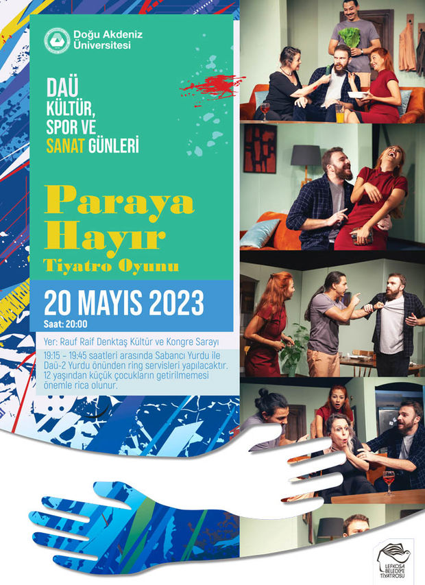 Saat 16:30’da, Aktivite Merkezi’nde Sıla Tüfekçioğlu (Hayal Gezer) tarafından “Performatik Multimedya Atölyesi” konulu ve saat 17:00’de, Golf Sahası’nda “Oya Akın ile Drama ve Devrim” konulu atölye çalışmaları gerçekleştirilecek. Ayrıca, saat 20:00’de Rauf Raif Denktaş Kültür ve Kongre Sarayı’nda Lefkoşa Belediye Tiyatrosu’nun “Paraya Hayır” oyunu sahnelenecek. Flavia Coste’nin yazdığı, Can Kapyalı’nın çevirdiği, Osman Ateş’in yönettiği oyunda Kurtuluş Altaylı, Aysel Açelya Bükülmez, Özgür Oktay ve Fuat Zorali rol alıyor.