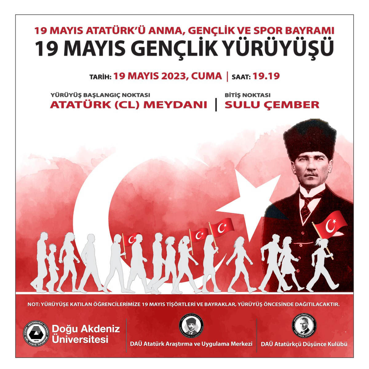 19 Mayıs 2023 Cuma günü, etkinlikler saat 10:00’da, Açık Basketbol Sahaları’nda düzenlenecek olan Streetball Turnuvası ile başlayacak. Saat 16.00’da DAÜ Golf Sahası’nda “Zehra Onbaşılar ile Enstrümanını Yarat ve Çal” konulu atölye çalışması gerçekleştirilecek. Öte yandan saat 19:00’da 19 Mayıs Yürüyüşü gerçekleştirilecek. DAÜ Atatürk Araştırma ve Uygulama Merkezi (DAÜ-ATAUM) ile DAÜ Atatürkçü Düşünce Kulübü iş birliğinde gerçekleştirilecek olan yürüyüş DAÜ Atatürk Meydanı’ndan başlayıp Mağusa Gelişim Akademisi’nde sona erecek.