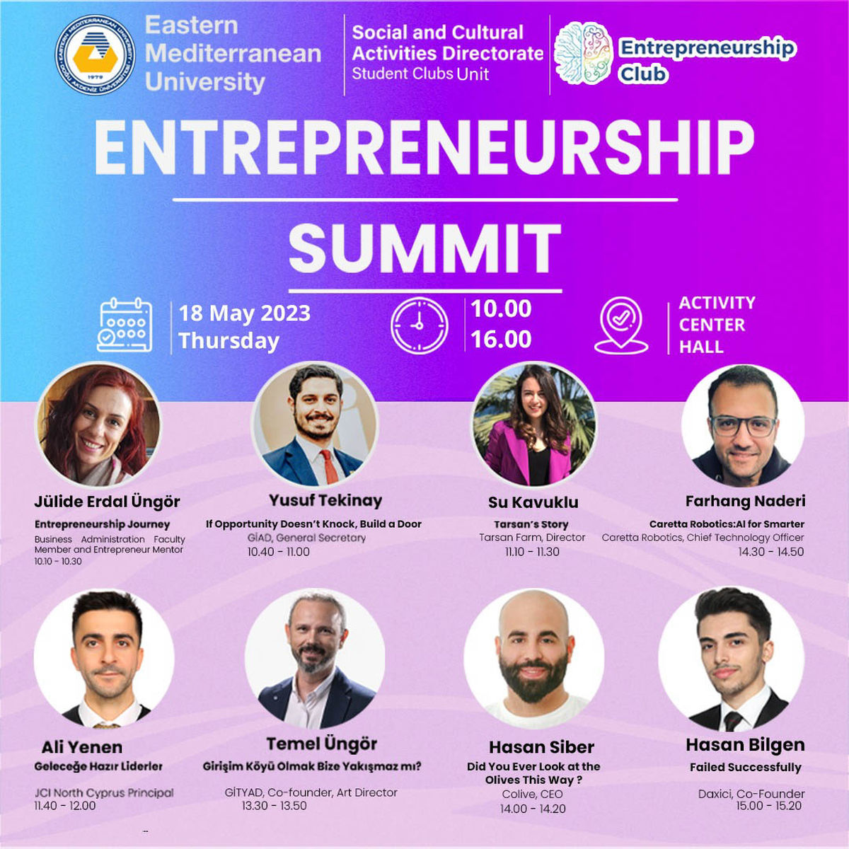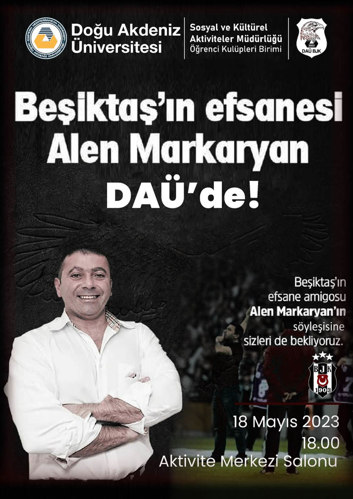 18 Mayıs 2023 Perşembe günü, saat 10:00’da, Aktivite Merkezi’nde Girişimcilik Kulübü tarafından girişimciliğin zorlu yolculuğunun anlatılacağı ve birbirinden değerli girişimcilerin yer alacağı “Girişimcilik Zirvesi” gerçekleştirilecek. Saat 14:30’da Fotoğrafçılık Kulübü tarafından Merkezi Derslikler Binası’nda “Özgün Düzensizlikler” isimli Yaratıcı Portre Sanatı Sergisi gerçekleştirilecek. Saat 18:00’de ise Beşiktaş Taraftar Kulübü DAÜBJK etkinliğinde, Beşiktaş’ın efsane amigosu Alen Markaryan söyleşi gerçekleştirecek.
