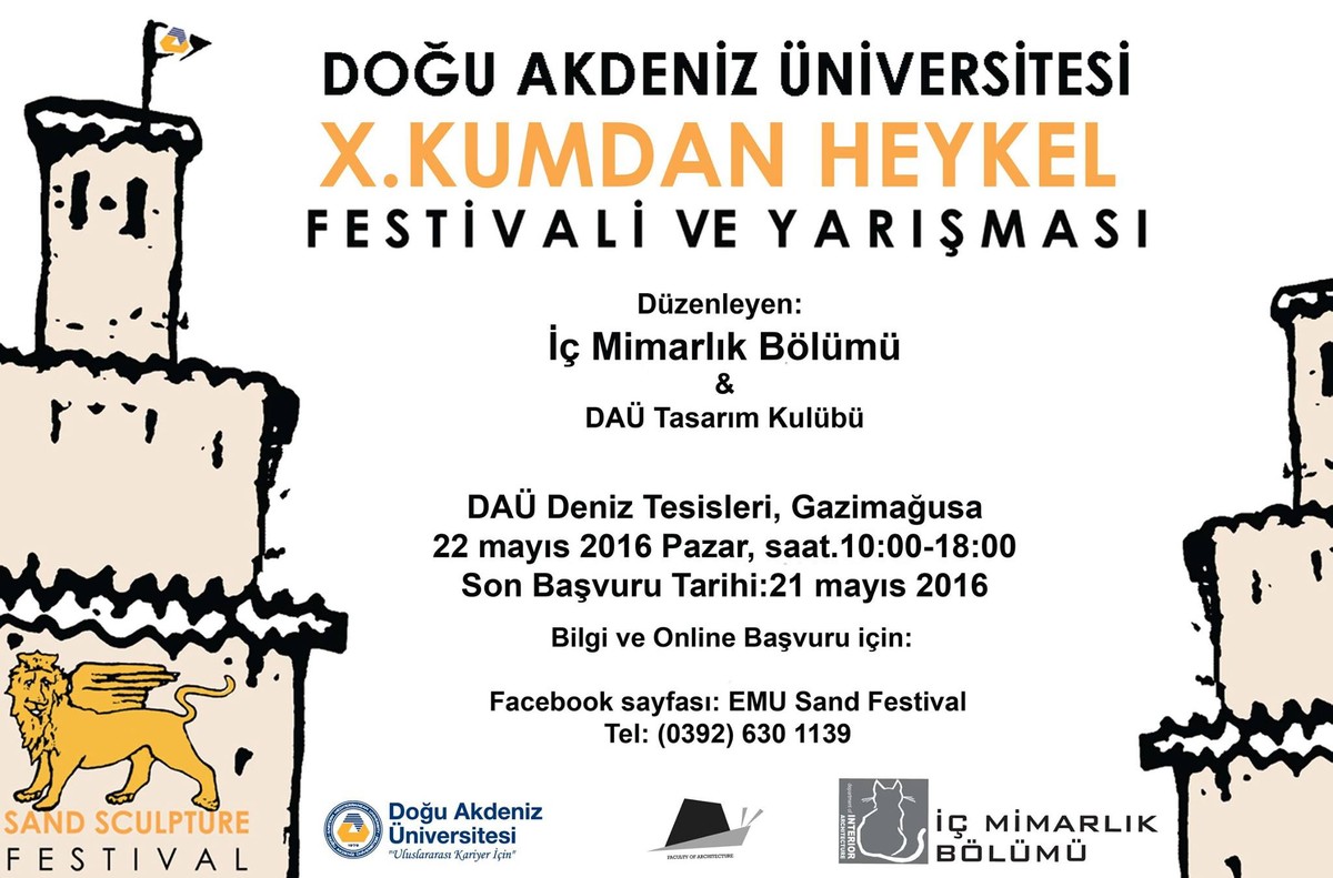 Geleneksel olarak yapılan ve Doğu Akdeniz Üniversitesi (DAÜ) Mimarlık Fakültesi, İç Mimarlık Bölümü ve DAÜ Tasarım Kulübü tarafından düzenlenen “DAÜ Kumdan Heykel Festivali ve Yarışması”nın onuncusu bu yıl 22 Mayıs 2016 Pazar günü, 10:00 – 18:00 saatleri arasında Gazimağusa’da bulunan, DAÜ Deniz Tesisleri’nde (Beach Club’da) yapılıyor.