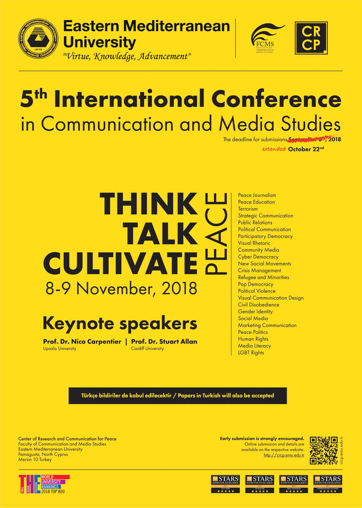 Doğu Akdeniz Üniversitesi (DAÜ) İletişim Fakültesi ve Barış İçin Araştırma ve İletişim Merkezi (BAİM) tarafından 8 – 9 Kasım 2018 tarihlerinde düzenlenecek olan 5. Uluslararası İletişim ve Medya Çalışmaları Konferansı için başvurular tüm hızıyla devam ediyor.