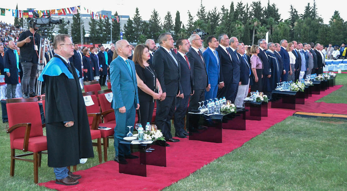 KKTC Başbakanı Ersin Tatar, konuşmasında şunları söyledi: “Ben de tam 40 yıl önce mezun oldum. İnsanlığa, memleketinize ve dünyaya hizmetleriniz olacaktır. Mutlaka başarılı olacağınıza inancım tamdır. Ailelerinize teşekkür ediyorum. Onların büyük fedakarlıklarıyla buralara kadar geldiniz ve bu güzel eğitimi aldınız. Bu güzel üniversiteden mezun olmanız sizleri bahtiyar etsin. Sizlere hayat boyu güzel bir gelecek, yüksek ideallerle insanlığa hizmet diliyorum. Bu duygularla sizleri kucaklıyorum” şeklinde konuştu.