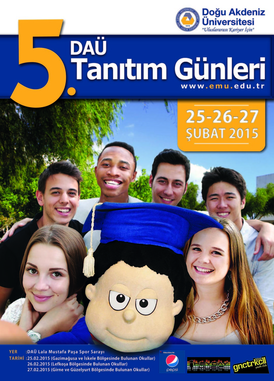 Kuzey Kıbrıs Türk Cumhuriyeti Milli Eğitim Bakanlığı’nın işbirliği ile Doğu Akdeniz Üniversitesi (DAÜ) tarafından düzenlenen “Geleneksel DAÜ Tanıtım Günleri” etkinliğinin altıncısı, bu yıl 26 – 27 Nisan 2016 tarihlerinde gerçekleştirilecek. Her yıl olduğu gibi DAÜ Lala Mustafa Paşa Spor Sarayı’nda yer alacak olan ve KKTC’deki lise son sınıf öğrencilere yönelik olarak hazırlanan organizasyonda, öğrenciler DAÜ tarafından okullarına gönderilecek otobüslerle DAÜ’ye gelerek, Üniversite bünyesindeki tüm akademik ve sosyal birimleri tanıma fırsatı yakalayacaklar.