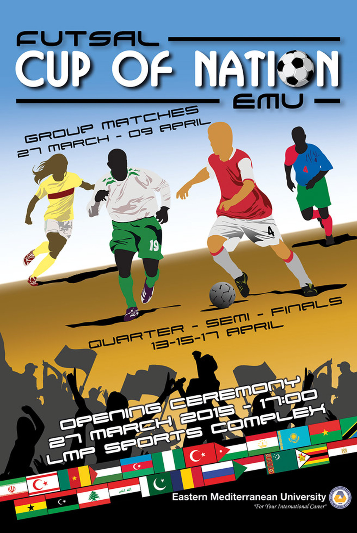 “DAÜ Uluslararası Futsal Cup of Nation” turnuvasının açılışı 27 Mart 2015 Cuma günü, saat 17:00’de, Lala Mustafa Paşa Spor Sarayı’nda gerçekleştirilecek. Farklı kültürlerin bir araya geleceği bu önemli organizasyona sadece üniversite öğrencileri ile personeli değil, tüm bölge halkı da davet ediliyor. Maç programı ise şu şekilde belirlendi: