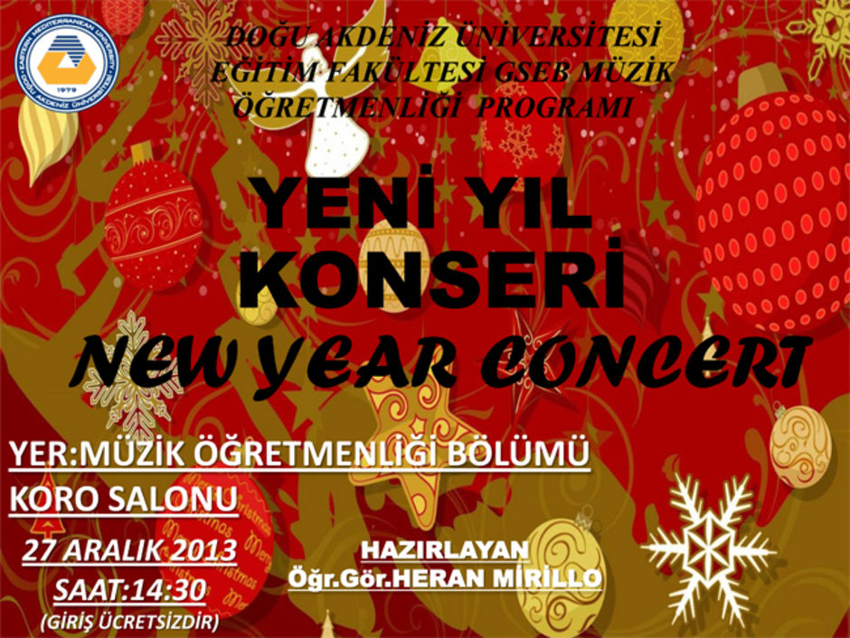 Prş, 26 Aralık 2013 17:00:00 #yeni yıl Başlangıç: Cum, 27 Aralık 2013 14:30:00 Bitiş: Cum, 27 Aralık 2013 16:30:00 Yer: Müzik Öğretmenliği Bölümü Koro Salonu Eastern Mediterranean University Eastern Mediterranean University