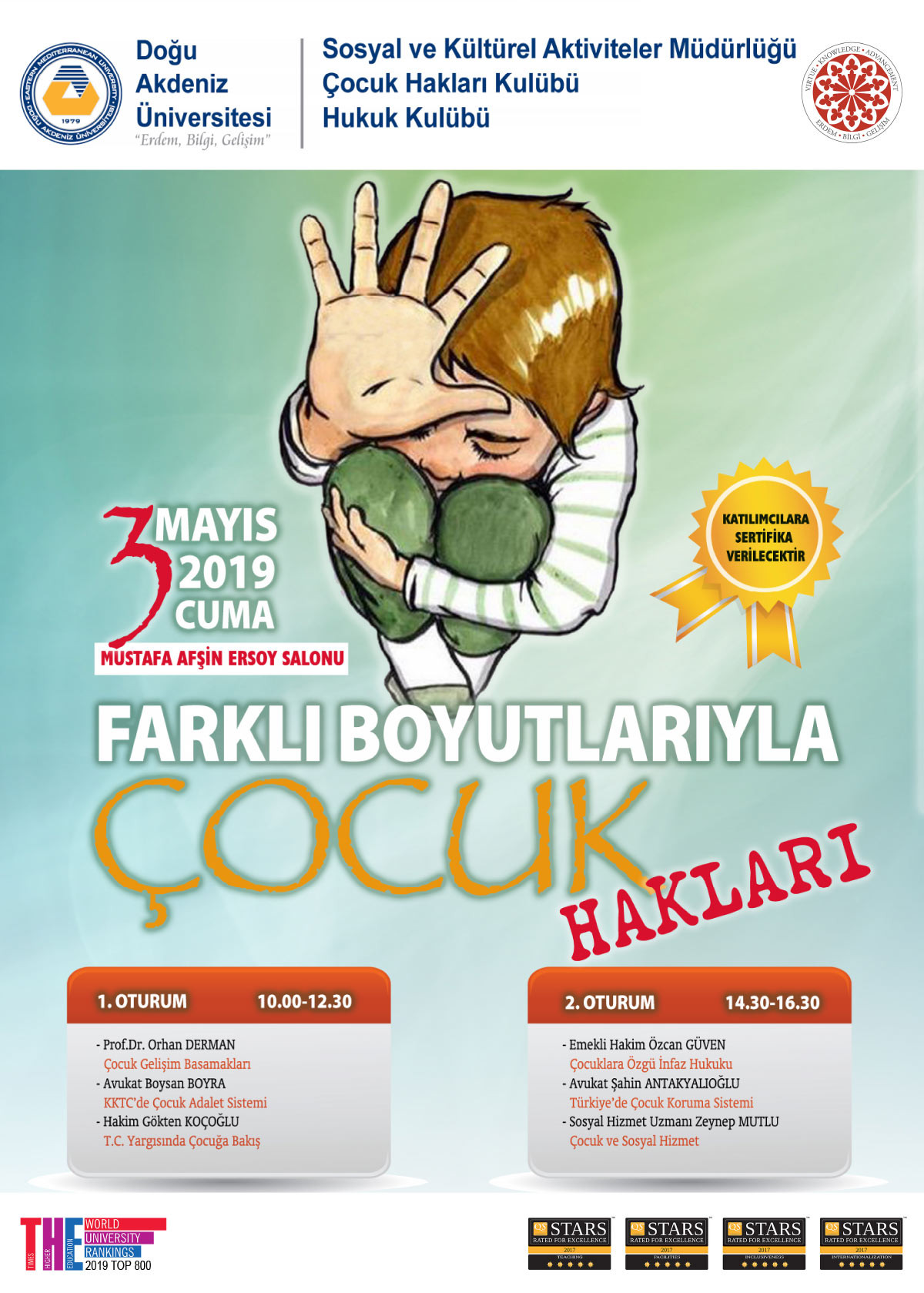 Prş, 25 Nisan 2019 12:55:00 #çocuk hakları Başlangıç: Cum, 3 Mayıs 2019 10:00:00 Bitiş: Cum, 3 Mayıs 2019 16:30:00 Yer: Mustafa Afşin Ersoy Salonu (CLA21) Eastern Mediterranean University Eastern Mediterranean University