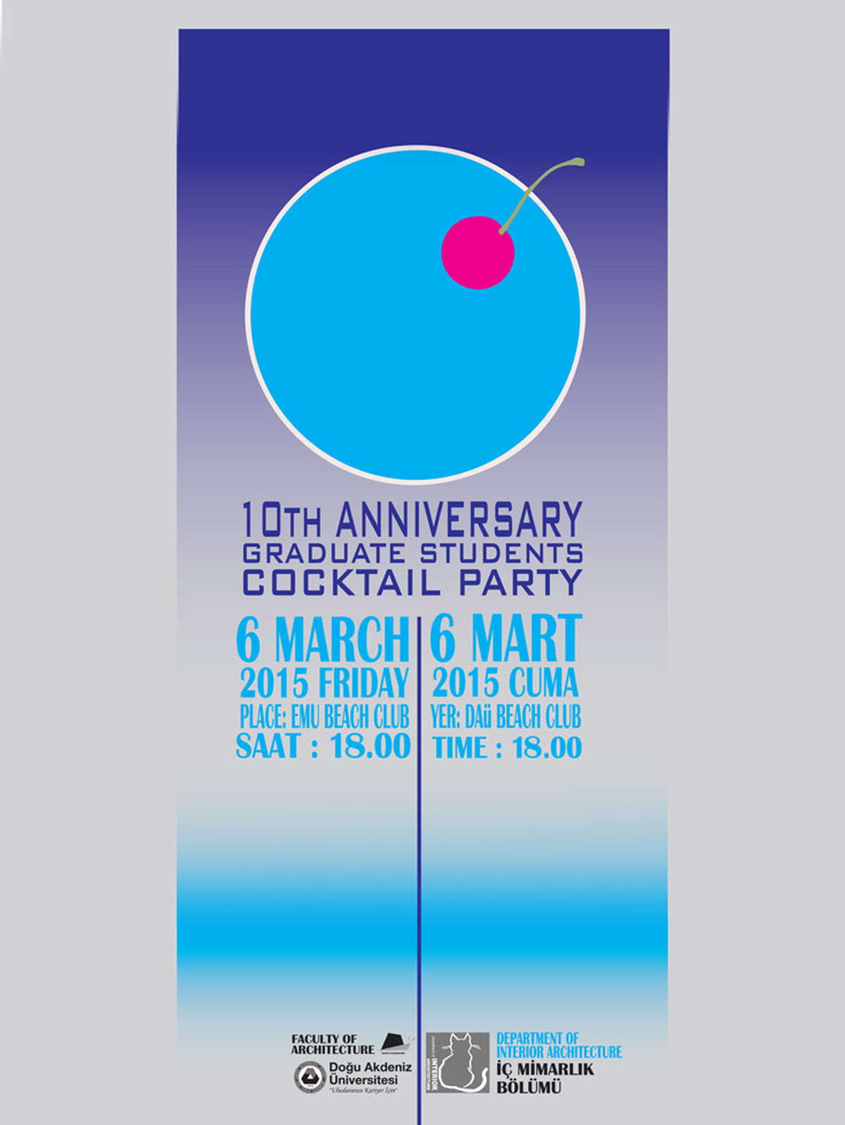Doğu Akdeniz Üniversitesi (DAÜ) Mimarlık Fakültesi, İç Mimarlık Bölümü, mezunlarıyla iletişimin önemine kalpten inanarak ilk mezunlar etkinliği olan “10.Yıl Kokteyli”ni, 6 Mart 2015 Cuma akşamı, 18:00 – 20:30 saatleri arasında, DAÜ Deniz Tesisleri’nde gerçekleştirecek olmanın gururunu yaşıyor.