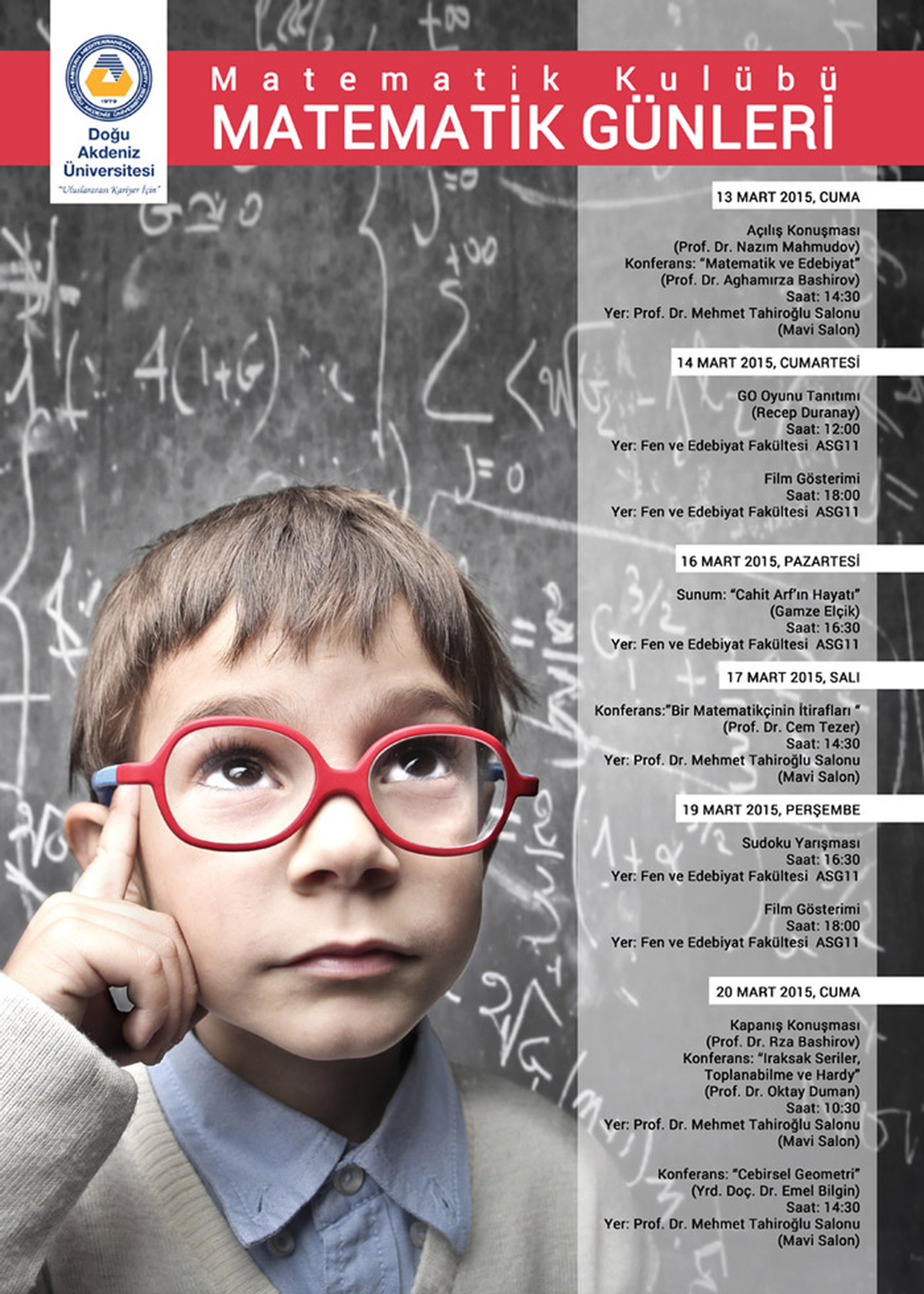 Sosyal ve Kültürel Aktiviteler Müdürlüğü`ne bağlı Matematik Kulübü tarafından organize edilen ve 13 - 20 Mart 2015 tarihleri arasında gerçekleştirilecek olan “Matematik Günleri” etkinliğine tüm Üniversitemiz davetlidir. Etkinlik programını aşağıda bulabilirsiniz.