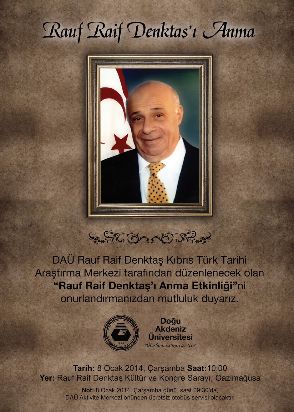 DAÜ Rauf Raif Denktaş Kıbrıs Türk Tarihi Araştırma Merkezi tarafındn düzenlenecek olan "Rauf Raif Denktaş'ı Anma Etkinliği"ni onurlandırmanızdan mutluluk duyarız.