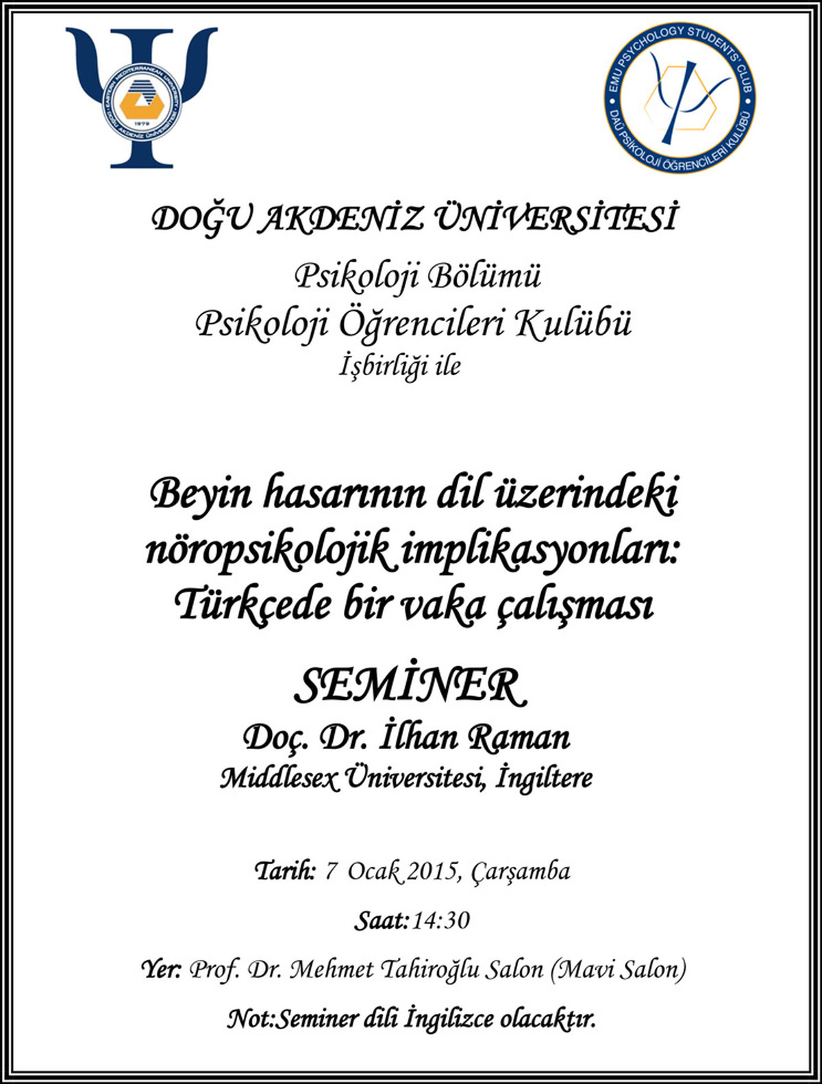 Sal, 6 Ocak 2015 10:25:00 #ilhan raman#psikoloji öğrencileri kulübü Başlangıç: Çrş, 7 Ocak 2015 14:30:00 Bitiş: Çrş, 7 Ocak 2015 17:30:00 Yer: Eastern Mediterranean University Eastern Mediterranean University