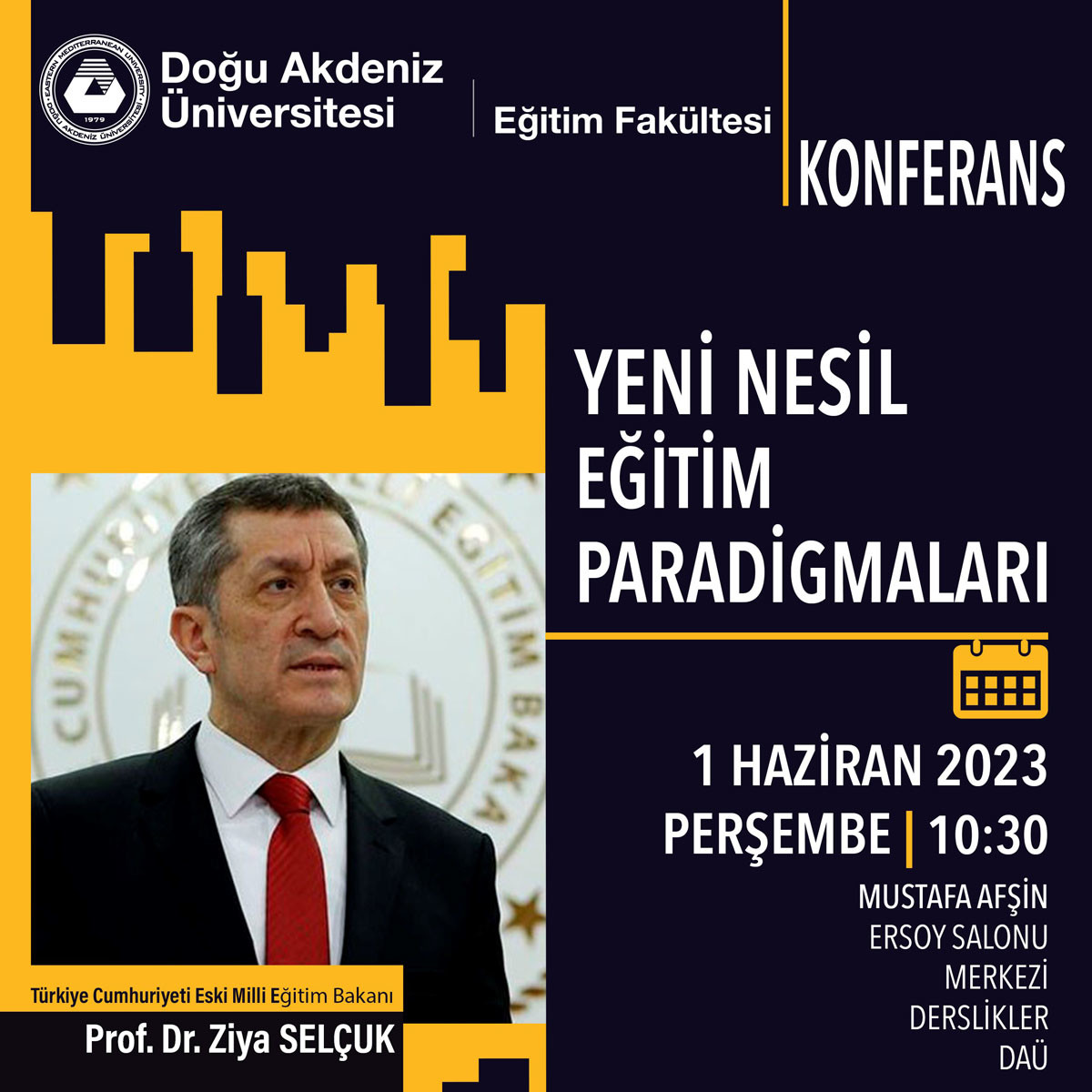Türkiye Cumhuriyeti (TC) Eski Milli Eğitim Bakanı Prof. Dr. Ziya Selçuk, Doğu Akdeniz Üniversitesi (DAÜ), Eğitim Fakültesi tarafından organize edilen konferansa katılacak. 1 Haziran 2023 Perşembe günü, saat 10:30’da Mustafa Afşin Ersoy Salonu’nda gerçekleştirilecek olan söz konusu konferansta Prof. Dr. Selçuk “Yeni Nesil Eğitim Paradigmaları” konulu sunumu ile öğretmen adaylarıyla bir araya gelecek.