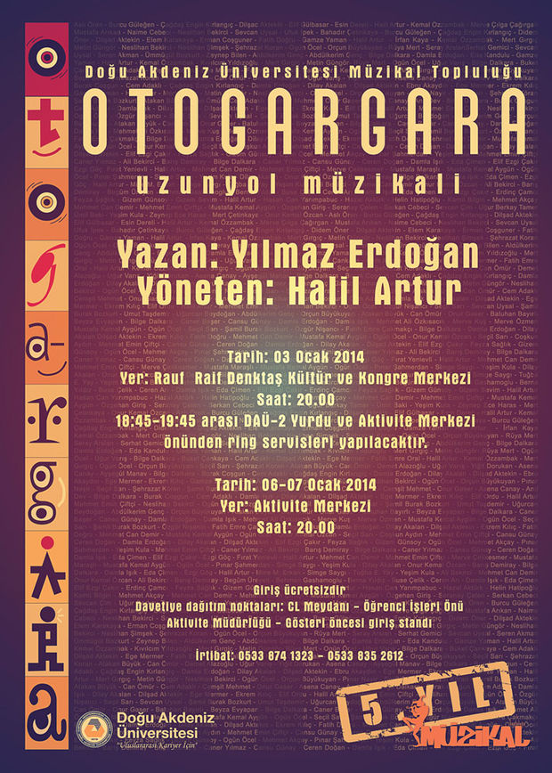 Sosyal ve Kültürel Aktiviteler Müdürlüğü`ne bağlı Müzikal Topluluğu tarafından organize edilen Yılmaz Erdoğan imzalı “Otogargara” adlı müzikal oyuna tüm üniversitemiz davetlidir.