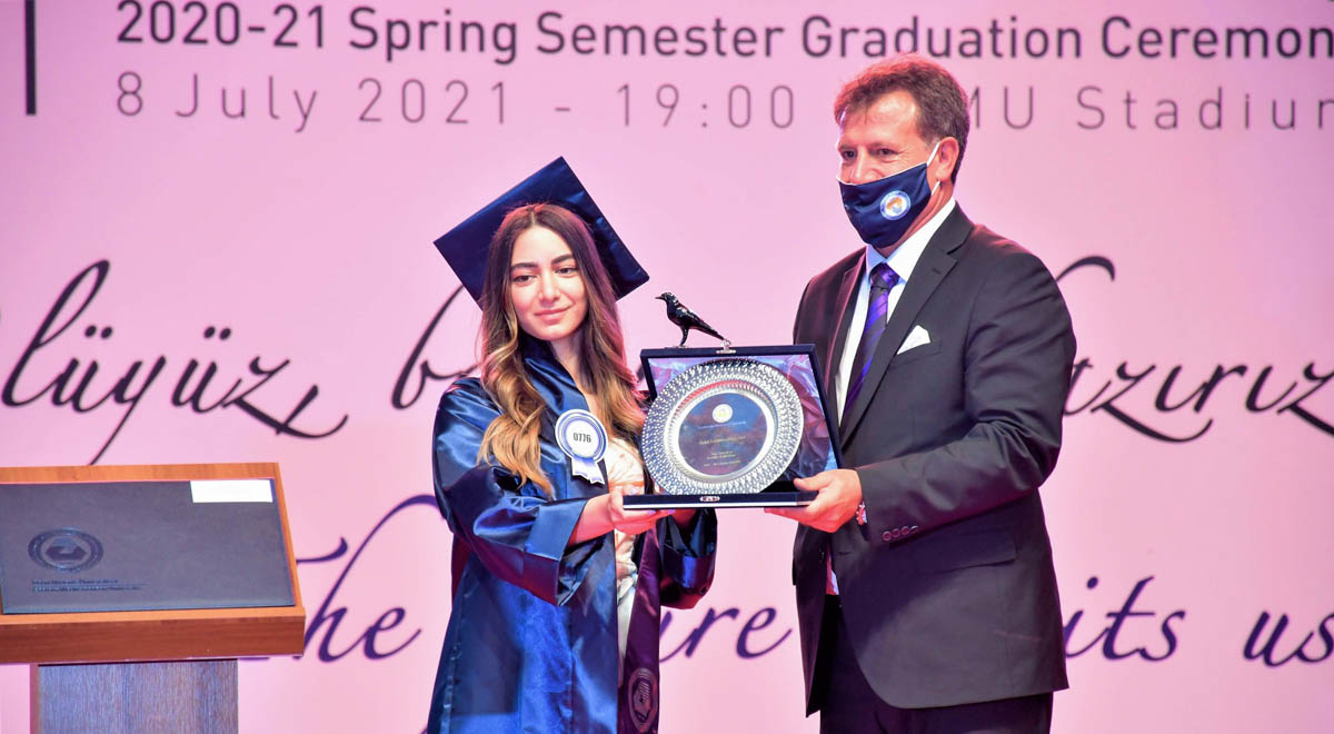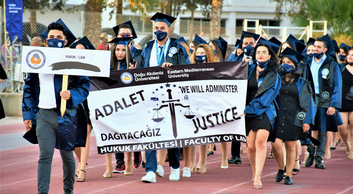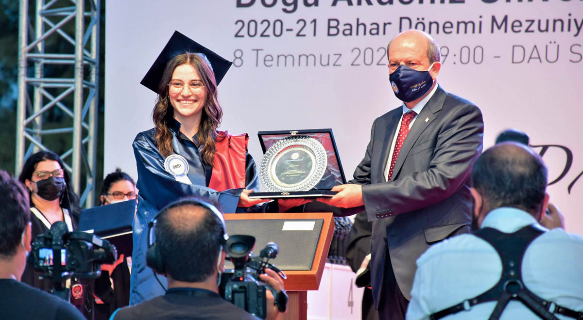 Doğu Akdeniz Üniversitesi (DAÜ) 2020 – 2021 Akademik Yılı Bahar Dönemi Ön Lisans ve Lisans Mezuniyet Töreni, 8 Temmuz 2021 Perşembe günü, saat 19:00’da, DAÜ Yasin Düşüner Stadyumu’nda gerçekleştirildi. Törende 1,400’e yakın ön lisans ve lisans mezunu diplomalarını aldı. Törene; Kuzey Kıbrıs Türk Cumhuriyeti (KKTC) Cumhurbaşkanı Ersin Tatar, Başbakan Yardımcısı ve Ekonomi Bakanı Erhan Arıklı, Bayındırlık ve Ulaştırma Bakanı Resmiye Eroğlu Canaltay, Milli Eğitim ve Kültür Bakanı Olgun Amcaoğlu, UBP Genel Sekreteri ve Milletvekili Oğuzhan Hasipoğlu, Cumhuriyetçi Türk Partisi Milletvekili Erkut Şahali, DAÜ Vakıf Yöneticiler Kurulu Başkanı Dr. Erdal Özcenk, DAÜ Rektörü Prof. Dr. Aykut Hocanın, DAÜ Vakıf Yöneticiler Kurulu Üyeleri, UKÜ Mütevelli Heyeti Başkan Yardımcısı ve DAÜ Eski Rektörü Prof. Dr. Abdullah Öztoprak’ın yanı sıra, ilçe mülki amirleri, akademisyenler, mezunlar ve aileleri katıldı. Her geçen yıl mezun sayısını artıran DAÜ’nün, 2020 – 2021 Akademik Yılı Bahar Dönemi’nde verdiği mezunları ile toplam mezun sayısı 66 bine yaklaşmış oldu.