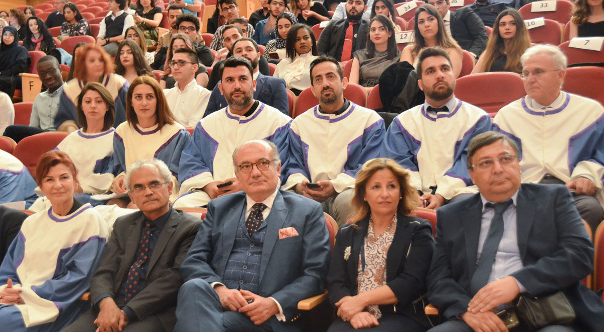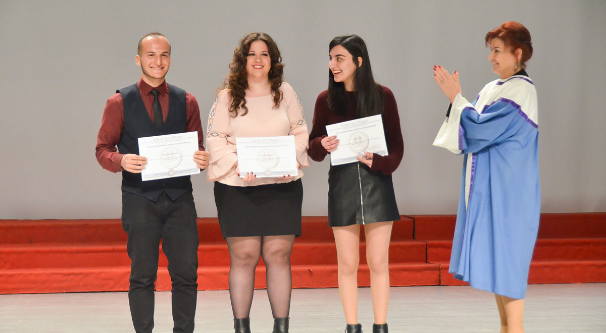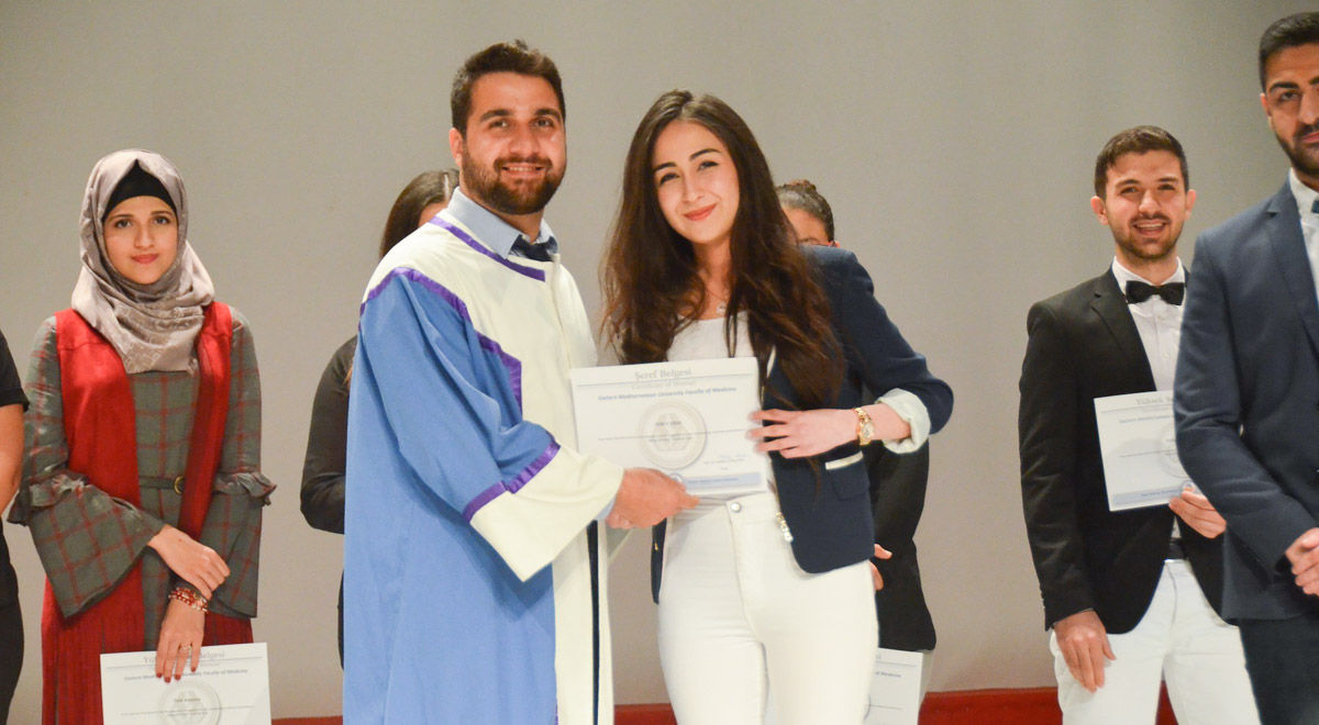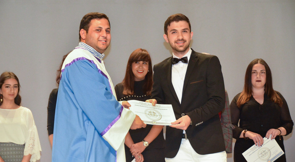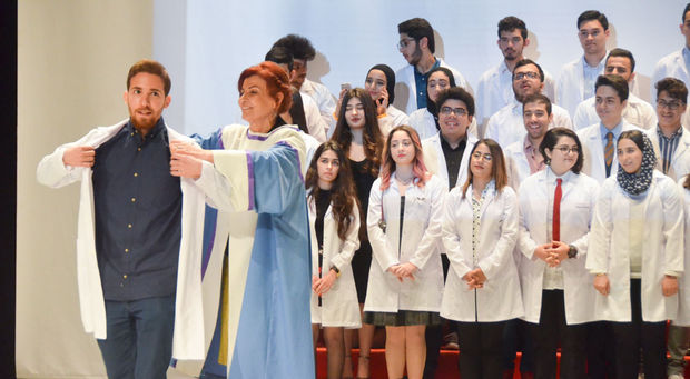 Doğu Akdeniz Üniversitesi (DAÜ) Dr. Fazıl Küçük Tıp Fakültesi tarafından 14 Mart Tıp Bayramı çerçevesinde düzenlenen etkinlikler kapsamında, DAÜ’lü genç hekim adayları beyaz önlük giyerek mesleğe ilk adımlarını attı. 14 Mart 2018 Çarşamba günü, saat 09:30’da, DAÜ Atatürk Meydanı’ndaki Atatürk Büstü’ne DAÜ Dr. Fazıl Küçük Tıp Fakültesi Dekanı Prof. Dr. Nahide Gökçora, akademik personel ve öğrenciler tarafından çelenk sunulmasının ardından, saat 14:00’te Rauf Raif Denktaş Kültür ve Kongre Sarayı’nda Beyaz Önlük Giydirme ile Yüksek Şeref – Şeref Sertifika Töreni gerçekleştirildi. Saygı Duruşu ve İstiklal Marşı ile başlayan tören, DAÜ Dr. Fazıl Küçük Tıp Fakültesi Tanıtım Filmi’nin gösterimi ve DAÜ Eğitim Fakültesi Güzel Sanatlar Eğitimi Bölümü Müzik Öğretmenliği Öğretim Üyeleri Makka Rothery ve Dilşad Asadova tarafından müzik dinletisi ile devam etti.