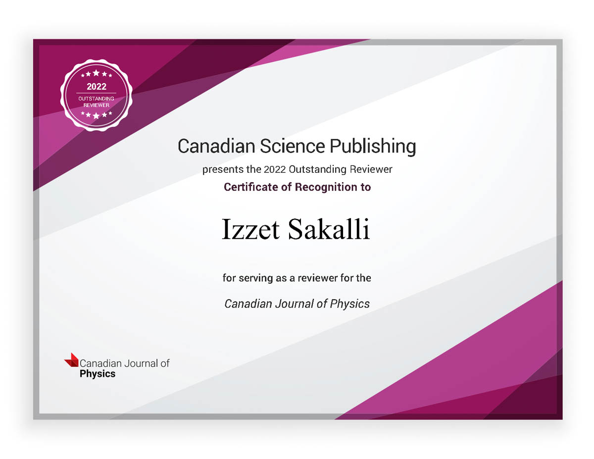 Doğu Akdeniz Üniversitesi (DAÜ) Fen ve Edebiyat Fakültesi, Fizik Bölümü Öğretim Üyelerinden, aynı zamanda Fizik ve Kimya Bölümleri Bölüm Başkanı Prof. Dr. İzzet Sakallı’ya Kanada’nın en köklü ve en büyük yayınevi olan Canadian Science Publishing’in bilimsel dergilerinden Canadian Journal of Physics tarafından 2022 yılının Üstün Hakemi (Outstanding Reviewer) ödülü verildi.