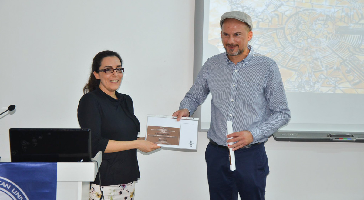 INTBAU Kıbrıs Başkanı Prof. Dr. Özgür Dinçyürek’in yapmış olduğu kapanış konuşmasının ardından, Dr. Caner’e katılımından dolayı sertifika ve anı olarak etkinliğin posteri takdim edilmiştir.