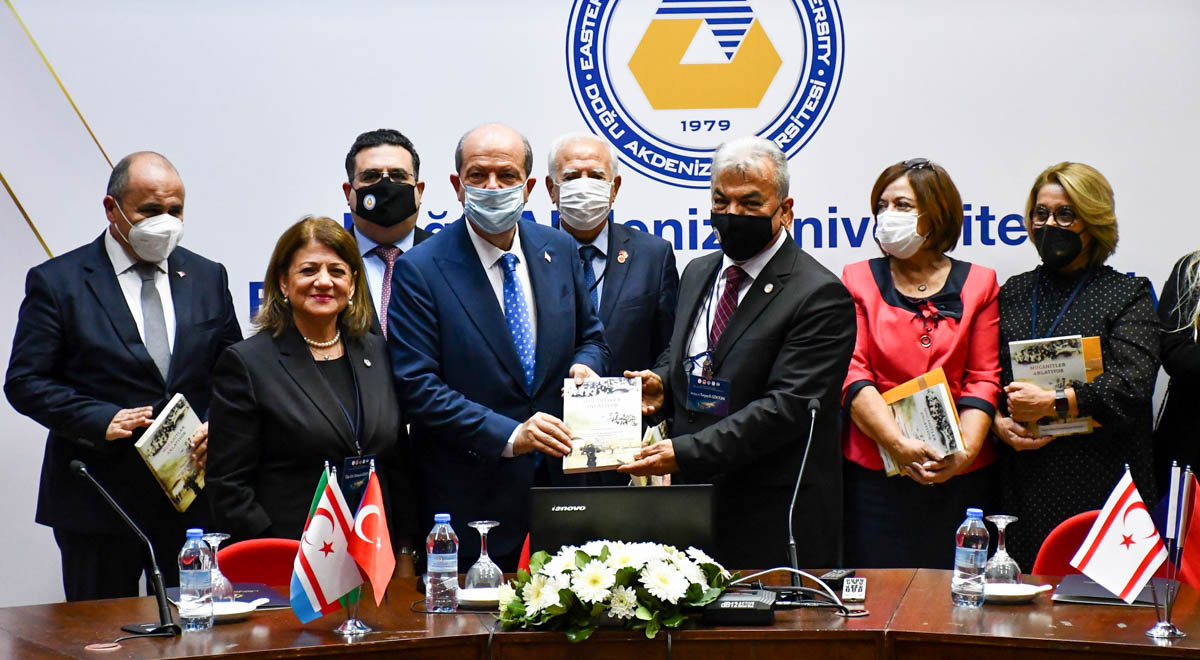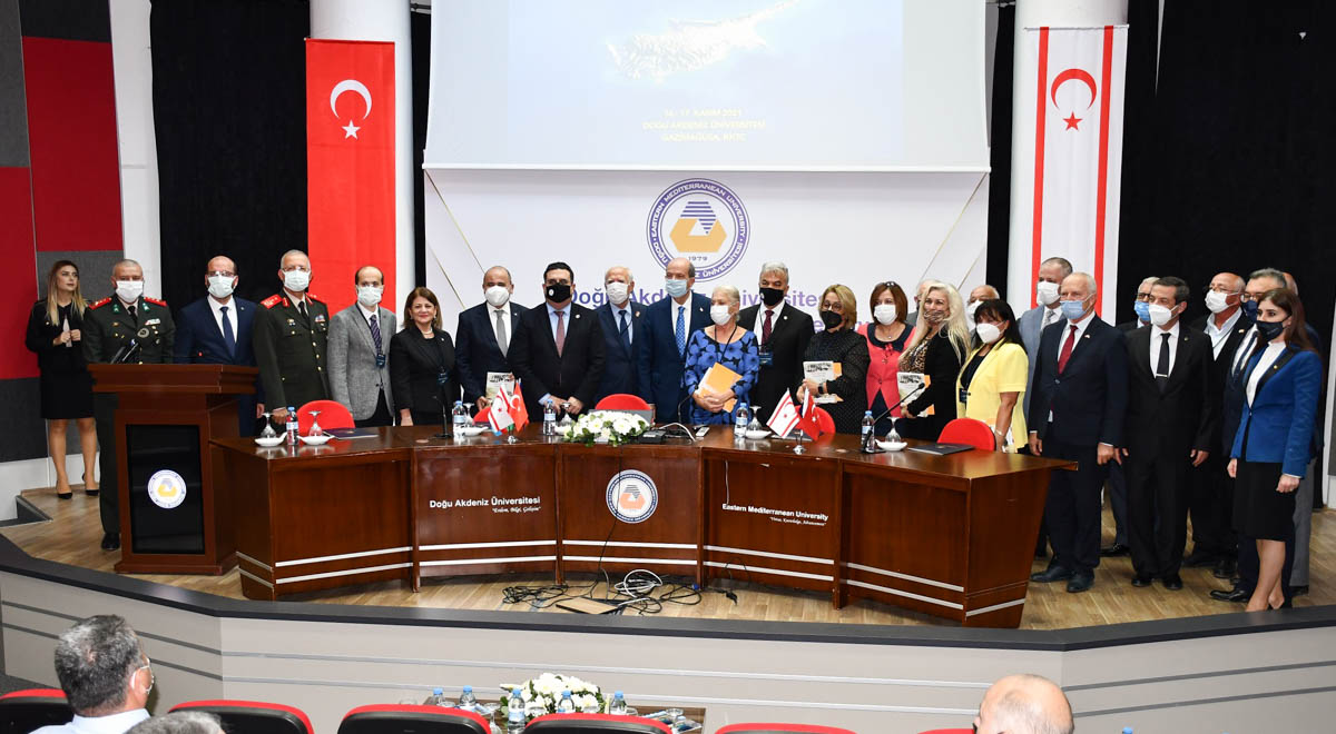 Türkiye Cumhuriyeti Atatürk Kültür, Dil ve Tarih Yüksek Kurumu, Türk Tarih Kurumu Başkanlığı ve Doğu Akdeniz Üniversitesi (DAÜ) Atatürk Araştırma ve Uygulama Merkezi (ATAUM) iş birliği ile düzenlenen “Fethin 450. Yılında Kıbrıs: Dünü, Bugünü ve Yarını” konulu uluslararası sempozyumun açılış töreni; 16 Kasım 2021 Salı günü, saat 10:00’da, DAÜ Mustafa Afşin Ersoy Salonu’nda gerçekleştirildi. Törene; Kuzey Kıbrıs Türk Cumhuriyeti (KKTC) Cumhurbaşkanı Ersin Tatar, Türkiye Cumhuriyeti Lefkoşa Büyükelçisi Ali Murat Başçeri, Kıbrıs Türk Barış Kuvvetleri Komutanı Tümg. Sezai Öztürk, Güvenlik Kuvvetleri Komutanı Tümg. Zorlu Topaloğlu, KKTC Dışişleri Bakanı Tahsin Ertuğruloğlu, Milletvekilleri İzlem Gürçağ Altuğra, Zorlu Töre ve Mesut Genç, DAÜ Vakıf Yöneticiler Kurulu Başkanı Dr. Erdal Özcenk, DAÜ Rektörü Prof. Dr. Aykut Hocanın, Vakıf Yöneticiler Kurulu Üyeleri, Rektör Yardımcıları, Mücahitler ve Aileleri, akademisyenler ve öğrenciler katıldı.