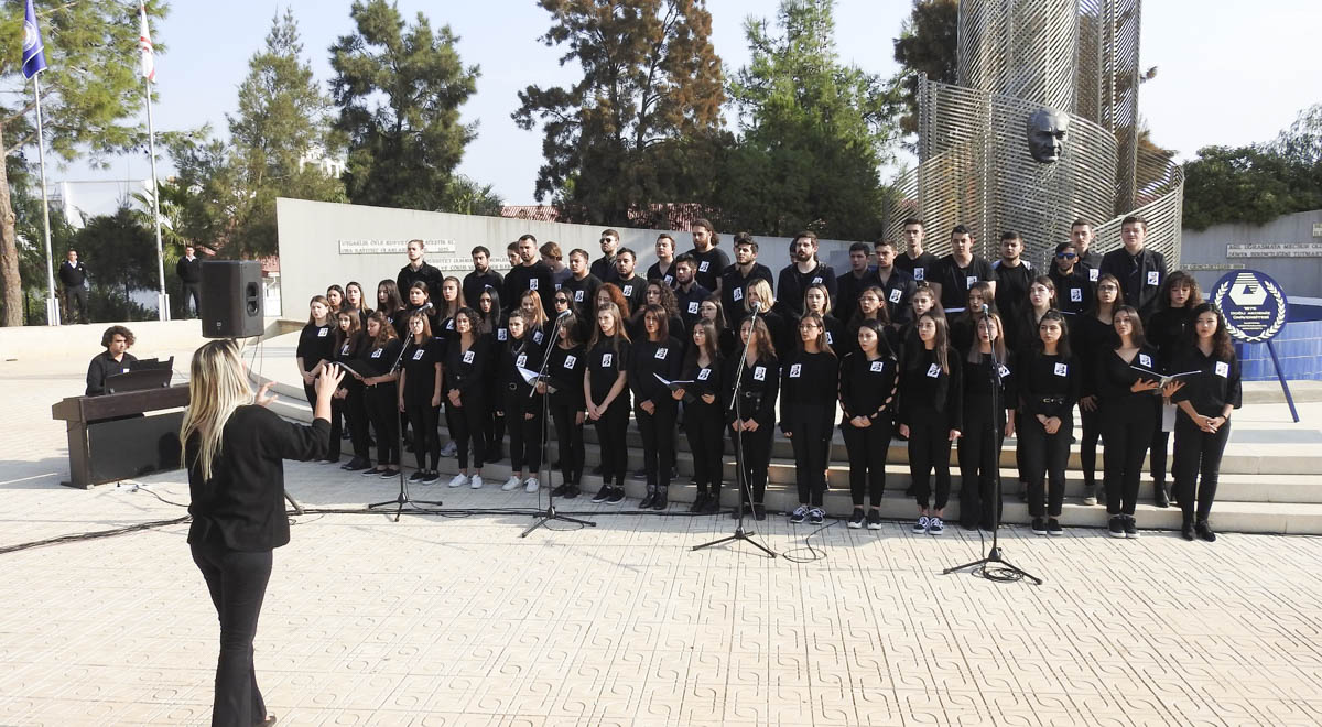 Bildirinin ardından saat 09:05’te sirenler eşliğinde Saygı Duruşu’nda bulunuldu ve ardından DAÜ Eğitim Fakültesi, Güzel Sanatlar Eğitimi Bölümü, Müzik Öğretmenliği Programı öğrencilerinden oluşan öğrenci korosu tarafından İstiklal Marşı ve 10 Kasım’a özel olarak hazırladıkları bir dizi müzik dinletisi gerçekleştirildi. Saat 09:10’da, DAÜ Rektörü Prof. Dr. Necdet Osam bir konuşma gerçekleştirdi. Prof. Dr. Osam, konuşmasında şunları söyledi: “Bir 10 Kasım’da yine Atatürk’ün manevi huzurunda toplanmış bulunuyoruz. Onun ilke ve inkılaplarını her gün daha derinlemesine içselleştiriyoruz. Kıbrıs Türkü, varlık mücadelesini çok uzun bir süreçten beri sürdürmeye devam etmektedir. Bu mücadelede Ulu Önder Mustafa Kemal Atatürk’ün ilke ve devrimlerinden ödün vermemiştir, vermeyecektir. O’nu, 81. ebediyete intikal yılında büyük bir özlem, sevgi ve minnetle anıyor, Kuzey Kıbrıs Türk Cumhuriyeti’nden şükranlarımızı sunuyoruz. Ruhu şad olsun.”